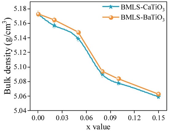 Variation in the bulk density of NiCuZn ferrites as a function of the MTiO3 content (x wt%). The composition follows the formula: (97 − x) wt% NiCuZnFe1.98O4 − 3 wt% BMLS glass − x wt% MTiO3 (M = Ca or Ba). A general decreasing trend in density is observed with increasing x for both Groups A and B.