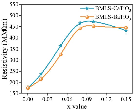 Figure 7 illustrates the variation in resistivity of NiCuZn samples. Notably, the resistivity exhibited a non-monotonic behavior, initially rising and subsequently declining as the concentration of either CaTiO3 or BaTiO3 was increased. When x = 0.10, the NiCuZn samples in group A and group B obtained the maximum values, respectively. In general, a grain boundary has a much higher resistivity than a microcrystal. Thus, the resistivity of NiCuZn ferrite is primarily determined by the grain boundary [,,]. The results in Figure 3 and Figure 4 indicated that the grain size of the NiCuZn samples gradually decreased as the additive content increased, indicating an obvious increase in the number of grain boundaries, thereby significantly improving the resistivity of the NiCuZn samples. Meanwhile, due to the relatively high melting point and high resistivity, CaTiO3 or BaTiO3 could be enriched at the grain boundary during the sintering process, which could further increase the resistivity of the NiCuZn samples [,,,]. Therefore, the resistivity of the NiCuZn samples showed an increasing variation trend with the increasing additive content. However, when the content of additives reached 0.15 wt%, excessive addition of CaTiO3 or BaTiO3 not only reduced the grain size, but also increased the porosity of the NiCuZn ferrites, which could significantly decrease the densification degree and the number of grain boundaries []. Therefore, a reduction in the resistivity was observed when x = 0.15. In addition, it was also found that NiCuZn containing BMLS-CaTiO3 exhibited a higher resistivity than NiCuZn containing BMLS-BaTiO3 when the x value was the same. This finding may be related to the fact that CaTiO3 contributed to a more significant effect of crystal growth inhibition to increase the number of grain boundaries and reduce the grain size (analyzed and confirmed by Figure 3, Figure 4, and Figure 6), thereby greatly improving the resistivity.