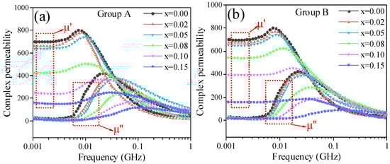Figure 9 gives the complex permeability spectra, including the real part of permeability (μ′) and imaginary part of permeability (μ″) of the NiCuZn samples in group A and group B. It was evident that the initial permeability of the NiCuZn samples in the two groups both decreased with the increasing content of CaTiO3 or BaTiO3. When x = 0.05, although the μ′ was reduced by the addition of CaTiO3 or BaTiO3, the NiCuZn samples in two groups still exhibited relatively high initial permeability of 636.95 and 651.55, respectively. When x increased from 0.05 to 0.15, the μ′ decreased rapidly with the increasing content of CaTiO3 or BaTiO3.
