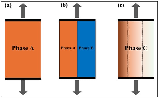 Schematic diagrams of different materials under iso-strain conditions: (a) Homogeneous material; (b) Voigt model for a two-phase composite; (c) Multilayer method for a functionally graded material.