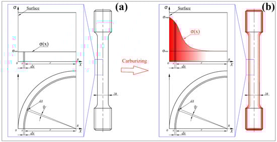 When σ(x) is a constant and equal to a0, also equals a0. In this case, a0 represents the tensile strength of the homogeneous, non-carburized 20CrNiMo base material. In this scenario, Equation (10) simplifies to the solution for a homogeneous material.