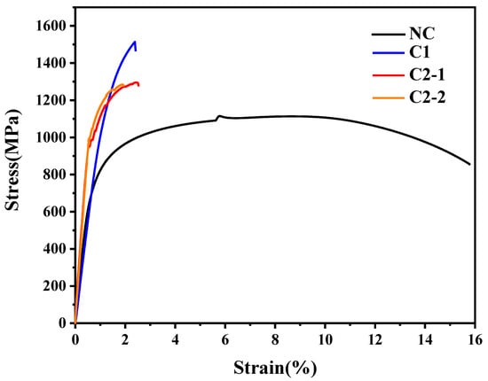 Similarly, the C2 demonstrates a characteristic brittle material curve, primarily composed of elastic and a brief plastic deformation stage, with a tensile strength of 1295.3 MPa. For C2, the prediction error of the composite strength method was 1.194%.