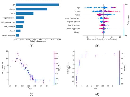Feature importance analysis and SHAP dependence of the SDM. (a) Feature importance; (b) SHAP overview; (c) Water-Cement dependency; (d) Age-Cement dependency.