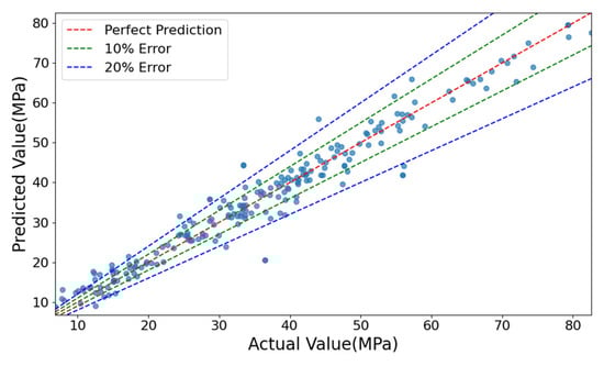 The SDM model demonstrated strong performance in predicting the compressive strength of conventional concrete. On the test set, the model achieved R2 = 0.95, RMSE = 3.81 MPa, and MAPE = 9.05%, indicating its ability to accurately capture the complex nonlinear relationships between feature parameters and strength.
