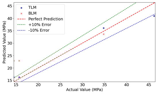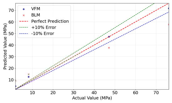 Figure 15 compares the predicted and actual values for the VFM and BLM models. The VFM model’s predictions closely follow the ideal prediction line, whereas the baseline model shows significant deviations, particularly in high-strength regions. This further confirms the superior predictive performance of the transfer learning model.