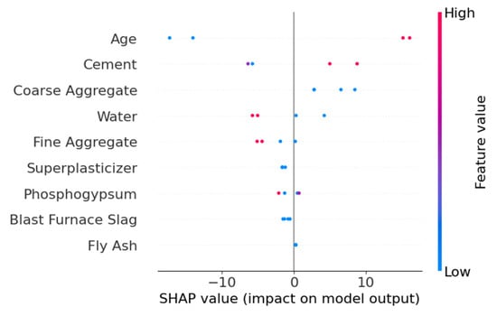 Figure 14 illustrates the SHAP overview for feature contributions. The Age and Cement features show dispersed SHAP values, indicating their complex influence on model outputs (both positive and negative effects). In contrast, Coarse Aggregate, Water, and Fine Aggregate exhibit more concentrated SHAP values, suggesting a more consistent impact. Other features, such as Superplasticizer, Phosphogypsum, Blast Furnace Slag, and Fly Ash, had minimal influence on strength predictions.