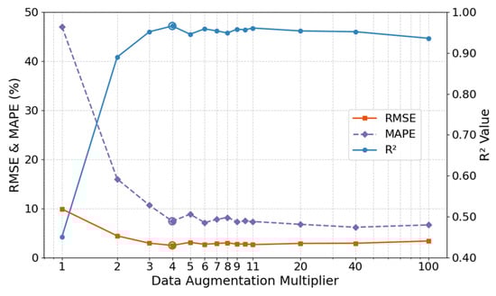 The data augmentation multiplier governs the target-domain knowledge supplementation intensity in transfer learning, representing a critical trade-off parameter between generation efficiency and model generalization capability. This study systematically tested prediction performance across augmentation multipliers ranging from 1 to 100×, quantitatively revealing the nonlinear relationship between data expansion scale and model accuracy. The results in Figure 19 showed a non-monotonic relationship between augmentation multiplier and model performance, divisible into two phases:
