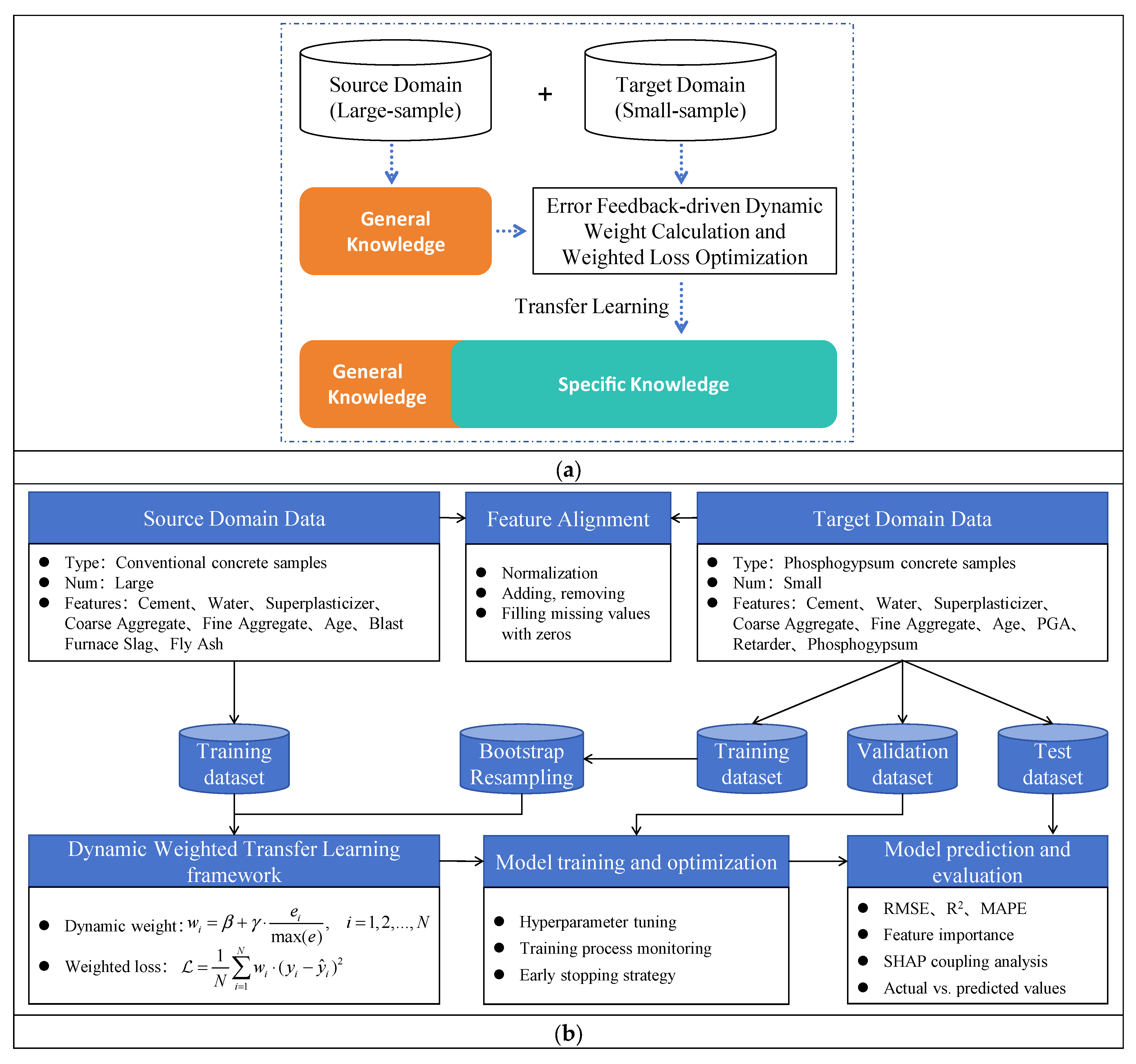 Therefore, a significant research gap exists in the absence of a high-precision, robust prediction model for PGC compressive strength, particularly under the practical constraint of small sample sizes. While transfer learning has shown promise in other concrete types, its specific application and optimization for PGC, which has unique material components and nonlinearities, remains unexplored. The primary purpose of this study is to bridge this gap by developing and validating a novel dynamic weighted transfer learning framework. This framework is specifically designed to leverage the vast knowledge from conventional concrete to accurately predict the strength of PGC even with limited experimental data, thereby providing a reliable tool for intelligent PGC design and promoting the sustainable utilization of this industrial byproduct.