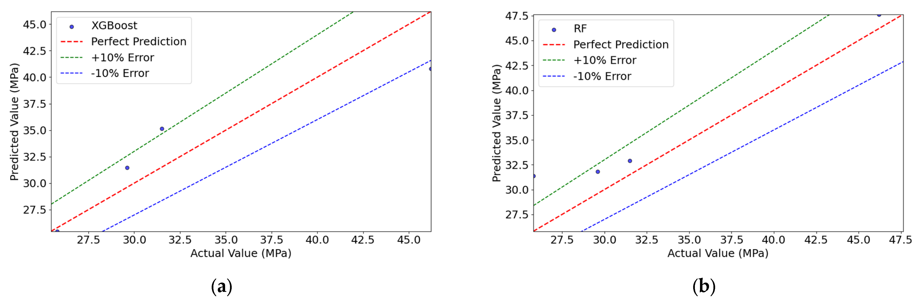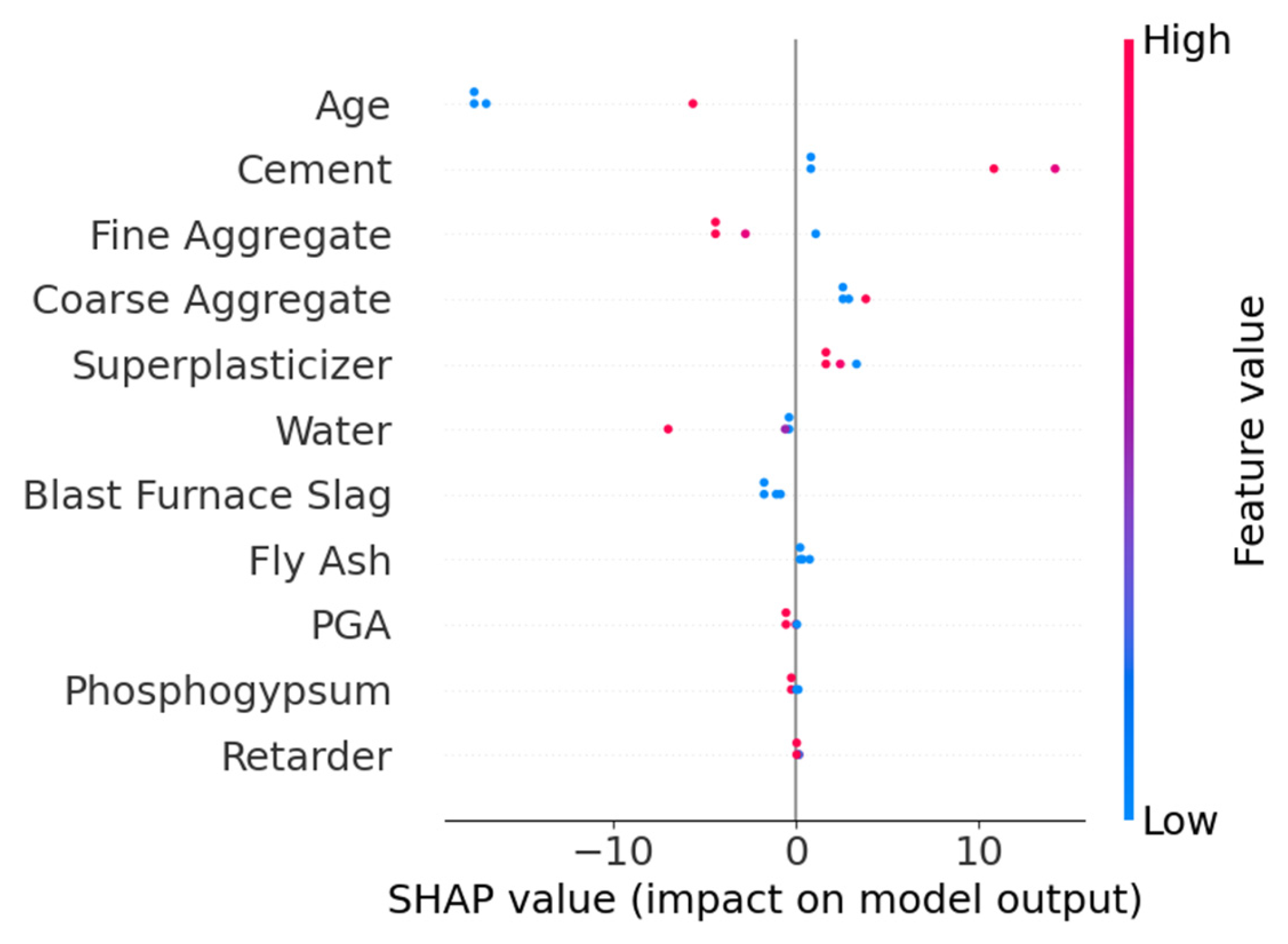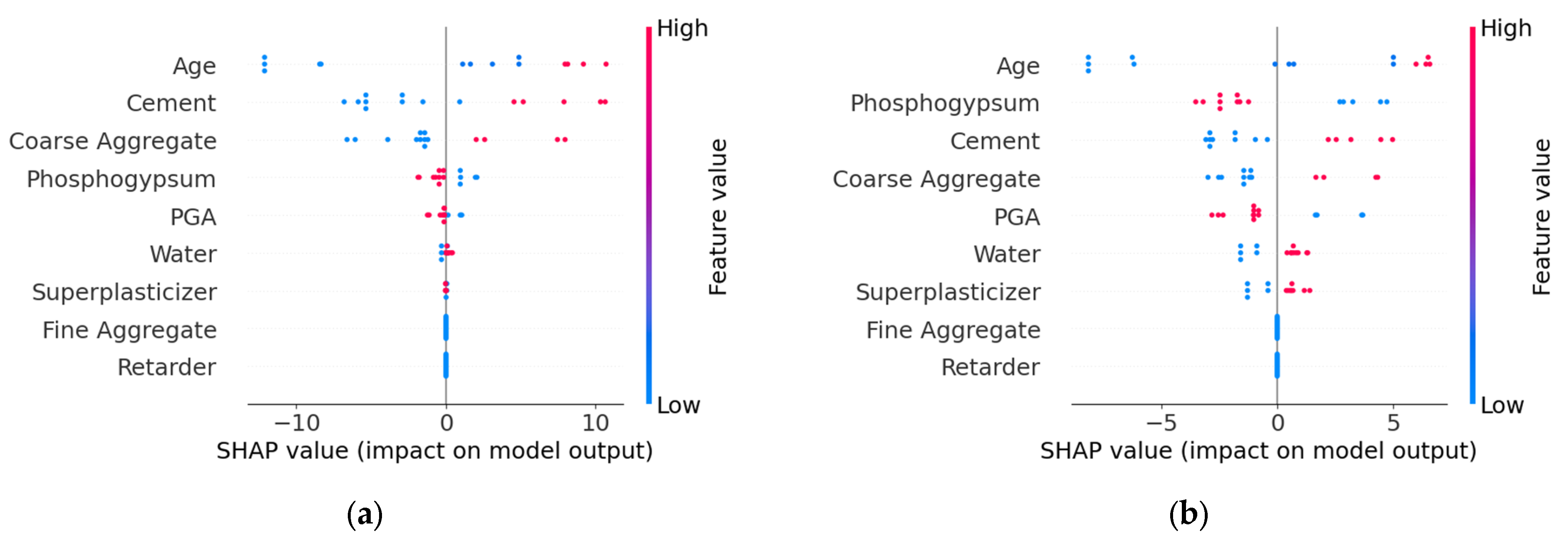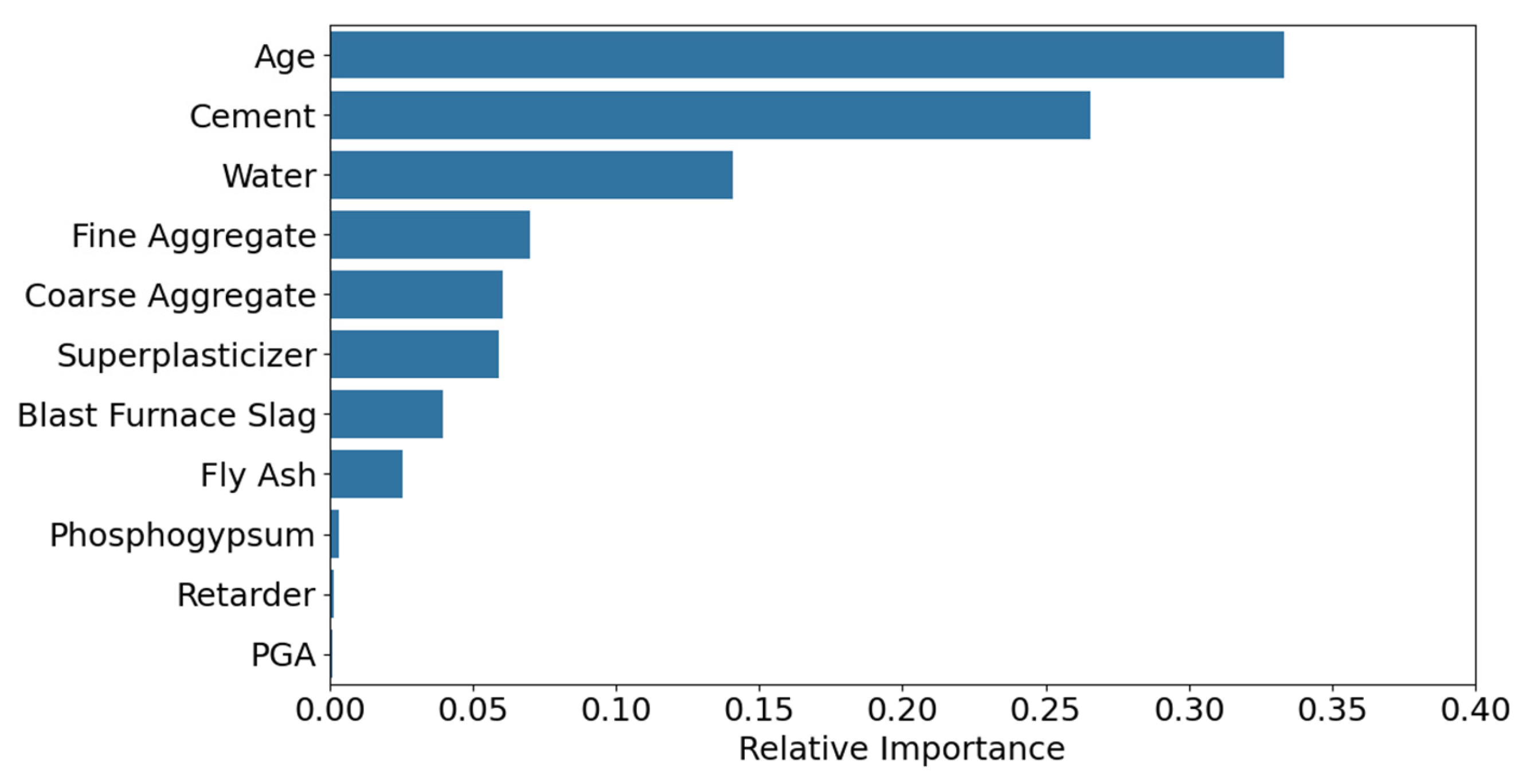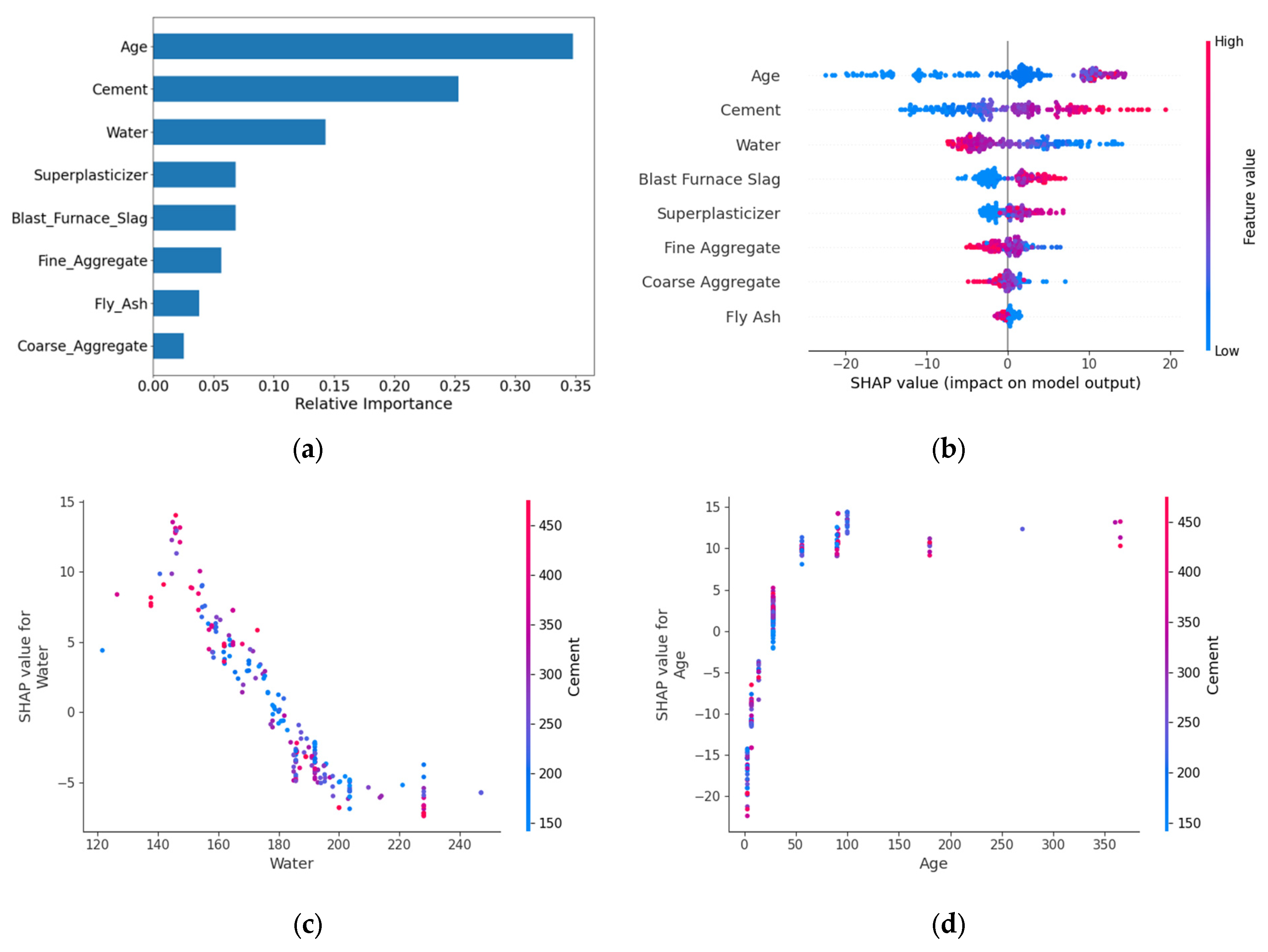 Machine learning techniques, through data-driven modeling, offer a novel approach to strength prediction, demonstrating significant advantages in handling multi-factor nonlinear relationships and reducing experimental costs [11]. El-Mir et al. [12] systematically compared Gaussian process regression (GPR), support vector machine (SVM), and regression tree models, finding that GPR achieved a root mean square error (RMSE) as low as 3.09 MPa for ultra-high-performance concrete, highlighting the impact of algorithm selection on prediction accuracy. Gupta [13] employed artificial neural network (ANN) to develop a geopolymer concrete prediction model, achieving an R2 of 0.904, which underscores the advantages of nonlinear activation functions. Güçlüer et al. [14,15] evaluated the performance of decision trees, SVM, and ANN, confirming that decision trees yielded a mean absolute error (MAE) of only 2.59 MPa under humidity influence but lacked sensitivity to high-dimensional features. Li et al. [16] applied Random Forest (RF) to basalt fiber-reinforced concrete, with confining pressure parameters scoring 0.42 in feature importance yet failing to resolve the instability in interpretability caused by feature interaction effects. Collectively, these studies indicate that the choice of machine learning models and feature engineering directly affects prediction accuracy. However, insufficient analysis of parameter interaction effects leads to significant instability in feature importance determination.