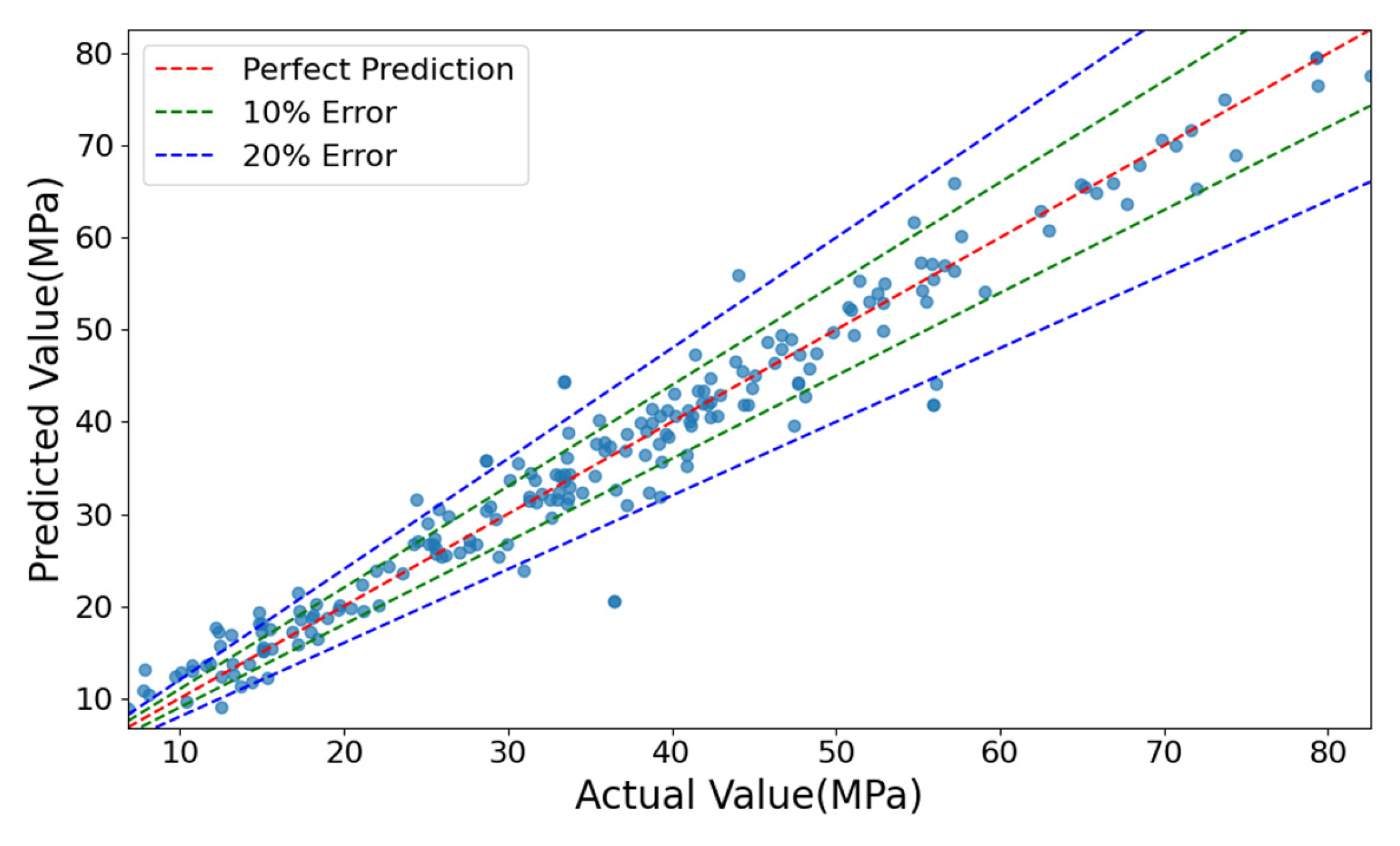 With the deepening application of machine learning in concrete strength prediction, researchers have begun exploring more advanced neural network architectures and ensemble strategies to further enhance models’ ability to characterize complex nonlinear relationships. Deep learning methods, through multi-level feature abstraction and nonlinear transformations, provide new technical pathways to overcome the performance bottlenecks of traditional machine learning algorithms. Aggarwal et al. [17] introduced deep neural networks into self-compacting concrete prediction, achieving a correlation coefficient of 0.907 using ReLU activation functions—a 3% improvement over traditional ANN. Li et al. [18] developed a stacked ensemble model combining the strengths of RF and eXtreme Gradient Boosting (XGBoost), achieving an R2 of 0.987 for rice husk ash concrete, though it did not resolve the underfitting risk under small-sample conditions. Zhang et al. [19] constructed a deep forest model that captured slag-superplasticizer interactions through multi-granularity scanning, reducing test set errors by 18% compared to single tree models. Mahmood et al. [20] compared eight algorithms for marble powder-modified concrete and found that ensemble models achieved an R2 exceeding 0.998 but excessive reliance on ideal mix-proportion data led to conflicts with physical constraints. These cases demonstrate that while increased algorithmic complexity can significantly enhance predictive capabilities for complex material systems, over-reliance on data fitting while neglecting deeper material science mechanisms results in severe robustness challenges when facing data noise and physical constraints.