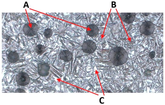 Example of microstructure of ADI cast iron, where: A—graphite, B—ferrite, C—austenite.