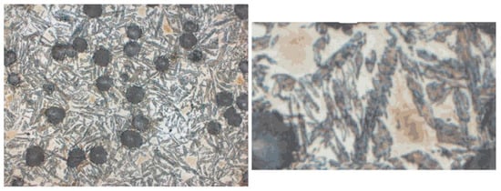 The microstructure of ADI strongly depends on the casting wall thickness, which influences the cooling rate. Thinner walls (e.g., 2–3 mm) result in faster heat dissipation, leading to a greater number of fine graphite inclusions (Figure 1 A); in thicker walls (e.g., 13 mm), fewer and larger graphite nodules are observed. Variable cooling conditions can also influence the presence of undesirable phases. One of the most important microstructural defects in ADI, particularly relevant to this work, is the presence of martensite (Figure 2).