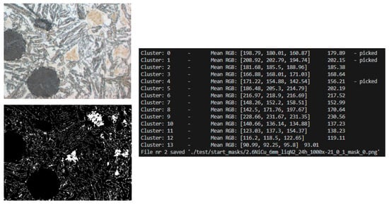 Subsequently, k-means (Figure 3) clustering was applied to the image fragments prepared in this way. The algorithm was implemented in Python using the scikit-learn library, and the result was binary masks saved in the output directory. After obtaining binary masks using k-means clustering, additional cleaning and standardization were necessary. This is because the clustering process, although effective in differentiating individual material phases, also generates minor distortions: isolated pixels, discontinuities within areas, or small empty spaces inside structures. To prepare the data for further analysis and model training, a set of morphological operations was applied, implemented in Python (v3.12) using the OpenCV library (v4.10.0).
