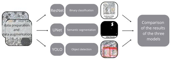 In tasks related to image analysis, and particularly in the recognition and localization of microstructural defects, Convolutional Neural Networks (CNNs) are currently the most effective and widely used approach. Their uniqueness stems from the fact that they can automatically learn feature representations from image data, eliminating the need for manual design of information extraction algorithms [,,,,,,,,,,,]. In this work, three popular architectures representing three approaches to image analysis were selected:
