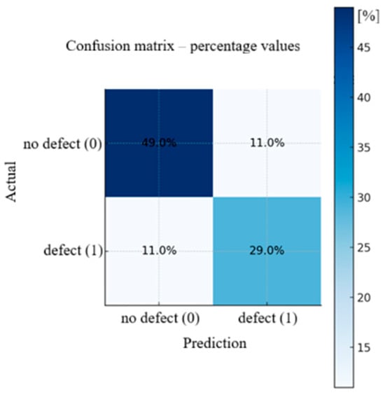 The obtained results indicate that ResNet50 effectively distinguishes fragments containing defects from those without them. Analysis of the confusion matrix (Figure 8) showed that the model performs very well in the case of clear clusters of martensite, while difficulties arise in images where the defect occurs as small or blurred structures. The model correctly classified 78% of cases, of which 49% were correct recognitions of no defect, and 29% were correct detections of a defect. Errors occur in 11% of cases for both classes. This means that some fragments where the boundary between martensite and the background was indistinct led to incorrect model decisions.