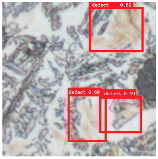 The YOLO architecture, although less frequently used in strictly materials literature than in medical image analysis or industrial vision systems, also confirmed its usefulness in the defect detection task. Similar to other publications, YOLO proved to be very fast and effective in detecting larger objects but had a tendency to miss fine structures. The mAP results obtained in the experiment fall within the range reported in the literature for tasks of similar complexity, although it should be noted that in this work, the network was trained from scratch without using pre-trained weights, which may have influenced the final accuracy.