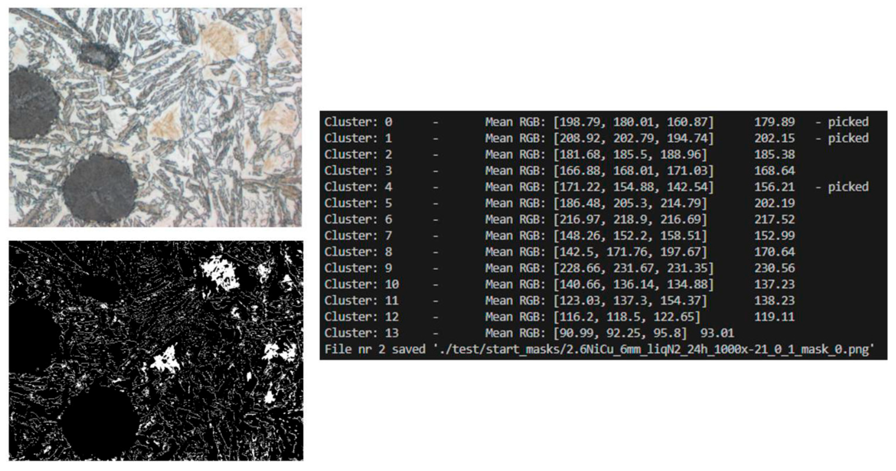 - The preparation of an original dataset including microstructure images along with their corresponding binary masks and detection labels. This process involved division of large images into smaller fragments, application of k-means clustering, morphological operations, and data augmentation, which ensured an adequate number and diversity of samples;