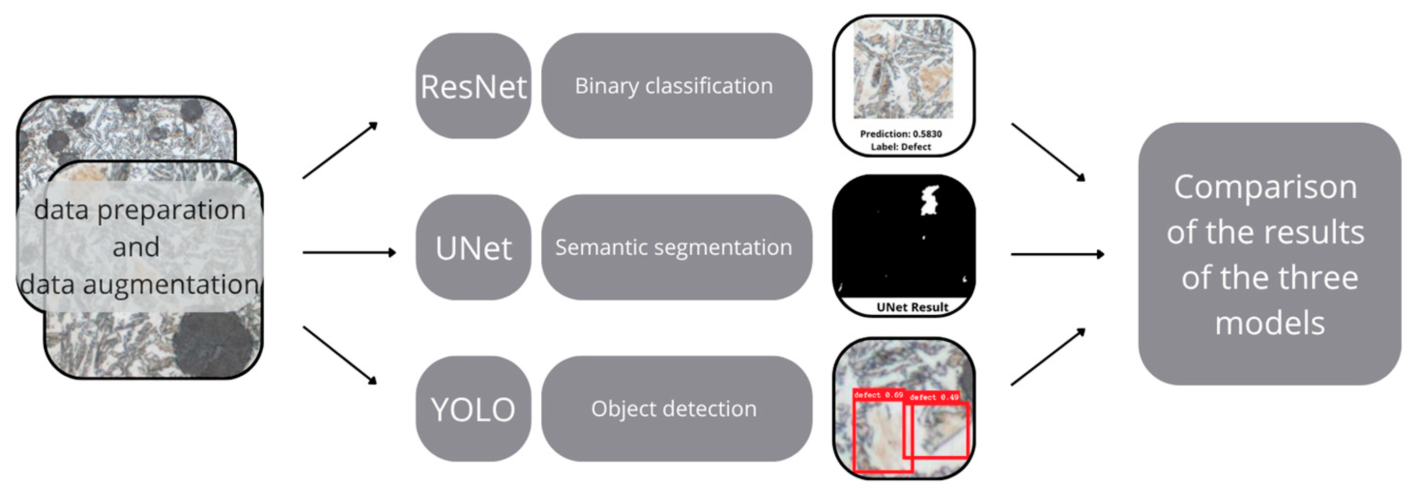 - YOLO—object detection (localization of defects in the form of bounding boxes).