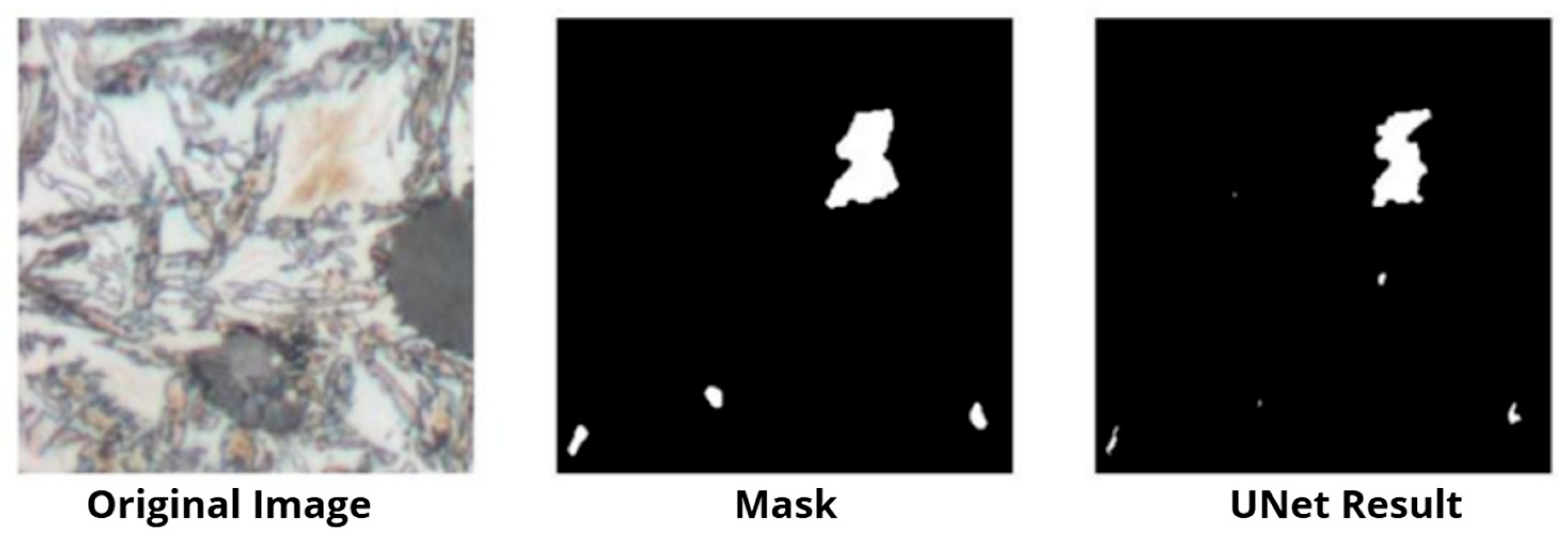 - UNet is a convolutional neural network architecture designed for precise semantic image segmentation, i.e., assigning a label to each input pixel. It was first presented in [23] as a tool for analyzing microscopic images in medicine [46]. Due to its versatility, efficiency, and ability to operate with limited datasets, UNet quickly found applications in many fields, including materials science [47]. The UNet architecture consists of two main parts: a contracting path and an expanding path. The contracting part operates analogously to classical convolutional networks—it consists of successive convolutional layers and pooling operations that reduce the image dimension while simultaneously increasing the network’s perceptual range. The goal of this part is to extract features with increasingly higher levels of abstraction. Then, in the expanding path, the image is successively restored to its original resolution using convolutional transposition operations (so-called upconvolution). At key points in the network, skip connections are used to copy feature maps from the corresponding levels of the shrinking path and connect them to the expansion layers. This allows UNet to combine global information (context) with local information (structure details), significantly improving segmentation quality, especially for fine, irregular structures [48]. UNet was designed for situations where small datasets are available, making it particularly attractive for materials science tasks, where labeled microscopic images are difficult and time-consuming to acquire [46]. The network can learn to effectively locate objects of interest even with a limited number of samples, as demonstrated in numerous publications on the segmentation of grains, pores, and non-metallic inclusions in metal microstructures [47]. In the context of this work, UNet was applied to segment areas containing martensite in microscopic images of ADI cast iron. This detection involves not only classifying the entire image but also pinpointing specific structural fragments where the defect is present. Thanks to its architecture, UNet is ideally suited for this task—it allows for high-precision marking of the contours and area occupied by the defect, even if its occurrence is irregular and localized. The advantage of using UNet is also the possibility of obtaining results in the form of segmentation masks, which can be subjected to further quantitative analysis—e.g., calculation of the area occupied by martensite, its shape, density or distribution relative to other phases. This type of data is extremely valuable in the context of quality control and prediction of mechanical properties of castings [47].