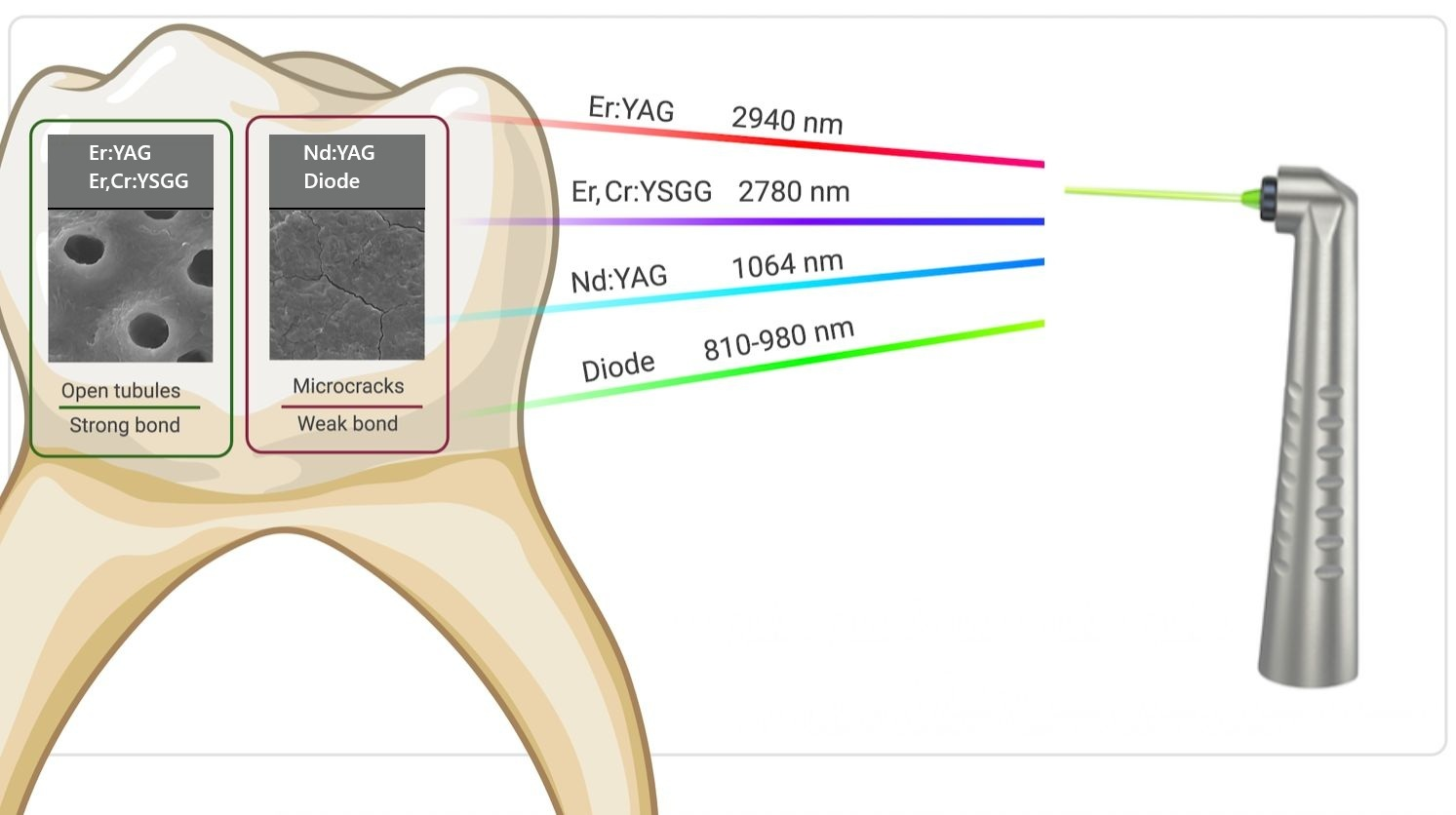 | Paryab [51] | Er:YAG Wavelength: 2940 nm Pulse duration: 450 μs Focal spot size: 0.785 mm2 Cooling: air/water Distance: 0.8–1.2 cm, non-contact, defocused mode Power: 3 or 4 W Energy: 300 or 400 mJ Frequency: 10 Hz | Dentine | Adhesives: Single Bond (3M ESPE, St. Paul, MN, USA) or Clearfil SE Bond (Kuraray, Osaka, Japan) Composite Filtek Z250 (3M ESPE, St. Paul, MN, USA) | Drill + Single Bond = 6.94 ± 2.12 MPa Drill + Clearfil SE = 9.00 ± 2.47 MPa Laser 300 mJ + Single Bond = 6.28 ± 2.58 MPa Laser 300 mJ + Clearfil SE = 6.42 ± 3.90 MPa Laser 400 mJ + Single Bond = 6.00 ± 3.16 MPa Laser 400 mJ + Clearfil SE = 5.62 ± 2.99 | The laser prepares a dentin surface with open tubules, no smear layer and no signs of charring within the parameters used. |