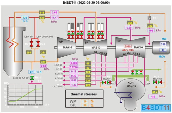 SCADA screen-view of the TG4 power plant unit, showing the flow of steam and locations where thermal stresses are monitored.