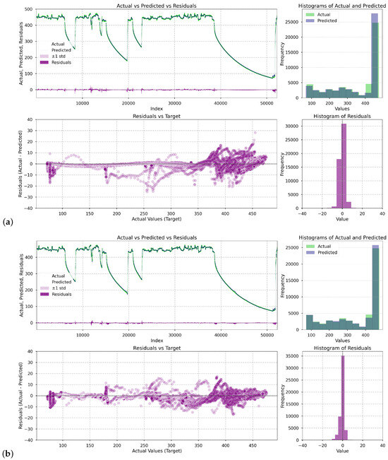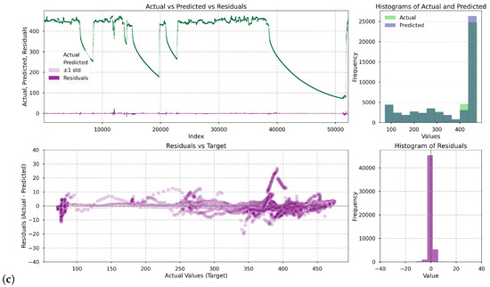 Figure 5 presents a series of visualizations illustrating how the deep learning models performed in the prediction task. For each of them, i.e., LSTM, Single Attentive Bi-GRU, Dual Attentive Bi-GRU, four plots were generated: (1) a comparison of actual (green) versus predicted (black) values of the casing temperature and versus residuals (purple) over time, (2) overlaid histograms showing the distribution of actual and predicted values, (3) a scatter plot showing the residuals as a function of the turbine casing temperature, and (4) a histogram of residuals.