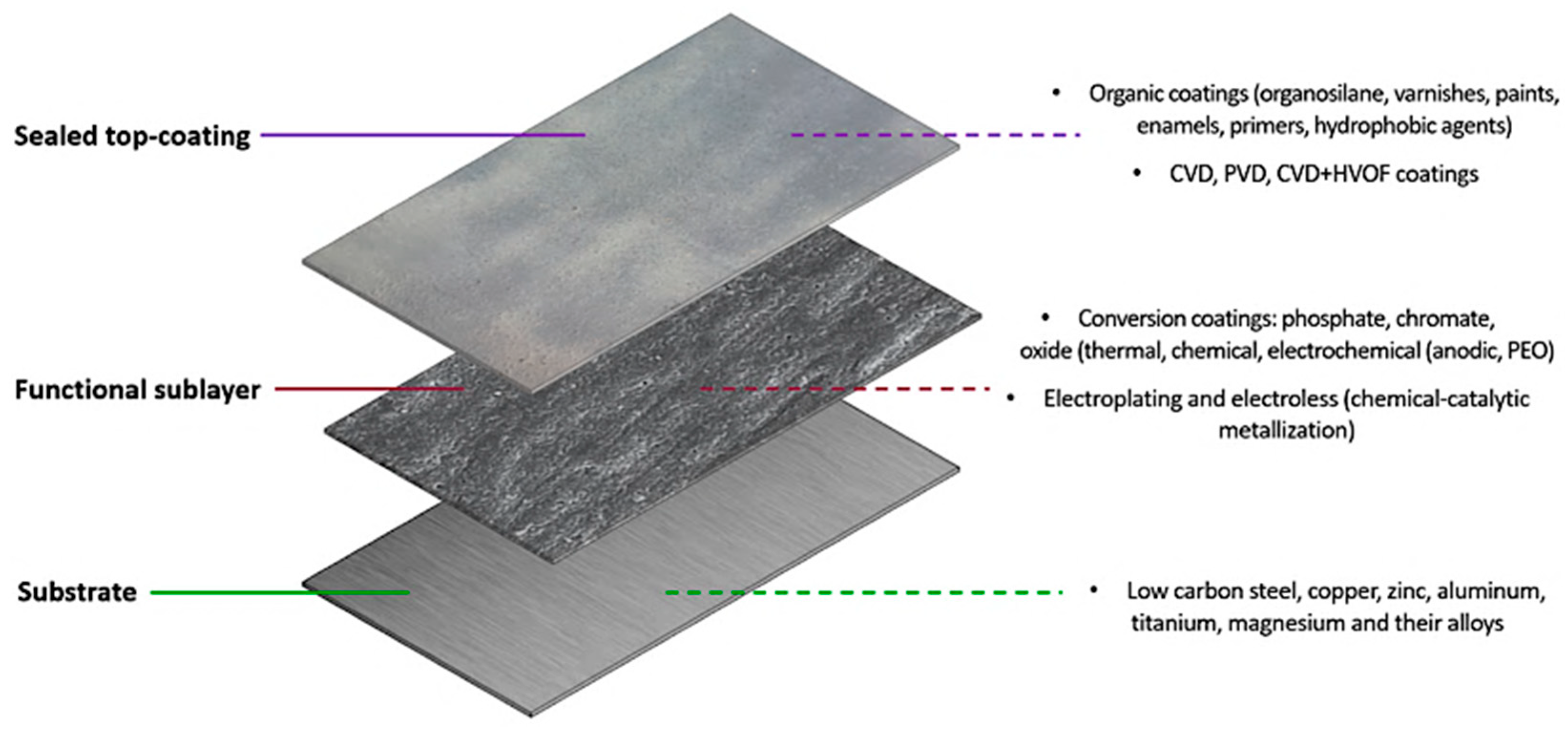 - Deposition of sublayers to improve adhesion, strength, and corrosion resistance using electroless and electroplating, application of oxide, phosphate or chromate conversion coatings;