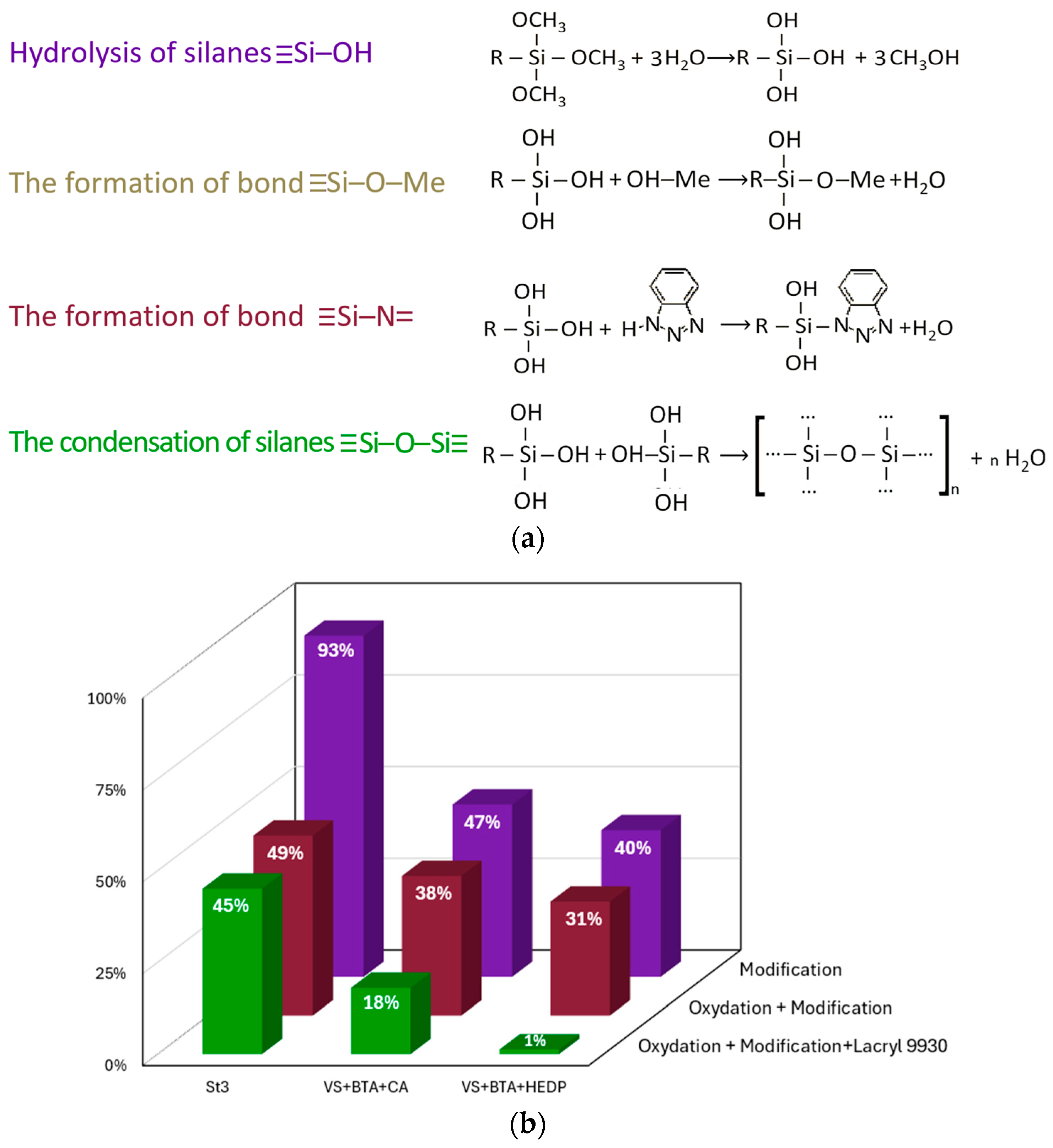 - Gladkikh, N.; Makarychev, Y.; Chirkunov, A.; Shapagin, A.; Petrunin, M.; Maksaeva, L.; Maleeva, M.; Yurasova, T.; Marshakov, A. Formation of Polymer-Like Anticorrosive Films based on Organosilanes with Benzotriazole, Carboxylic and Phosphonic Acids. Protection of Copper and Steel against Atmospheric Corrosion. Prog. Org. Coat. 2020, 141, 105544. [Google Scholar] [CrossRef]