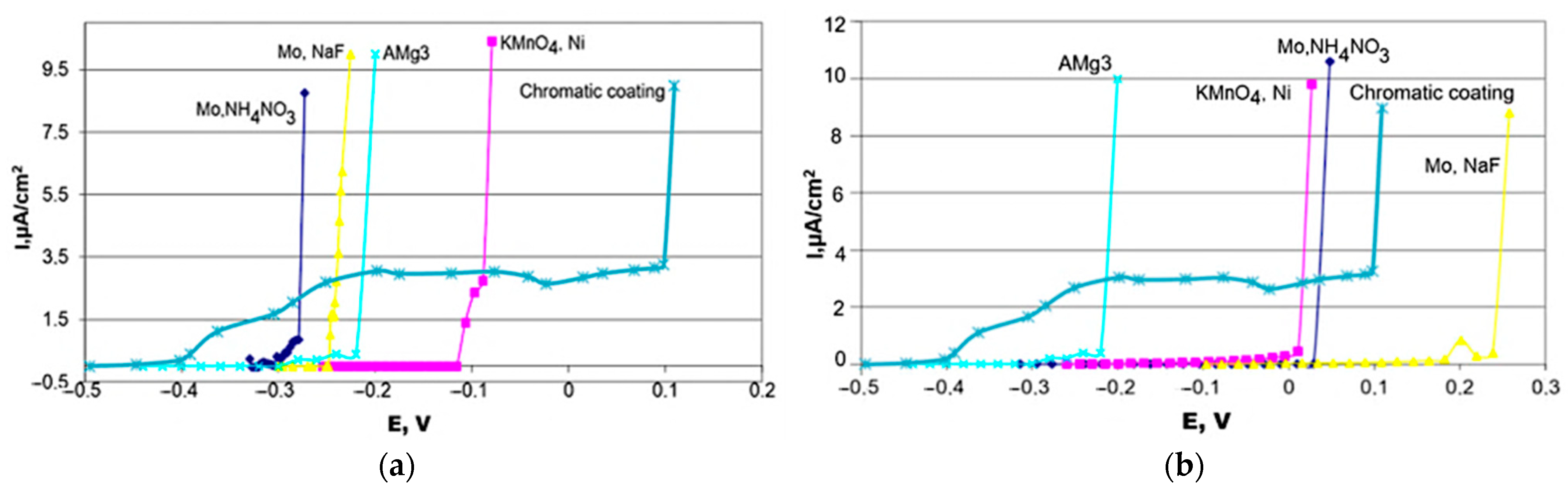 - Olejnik, S.V.; Kuzenkov, J.A.; Kuznetsov, J.I.; Rudnev, V.S.; Jarovaja, T.P.; Nedozorov, P.M. Method of Anticorrosion Processing of Aluminium Alloys. Patent RU2228387C1, 10 September 2014. 10p. [Google Scholar]
