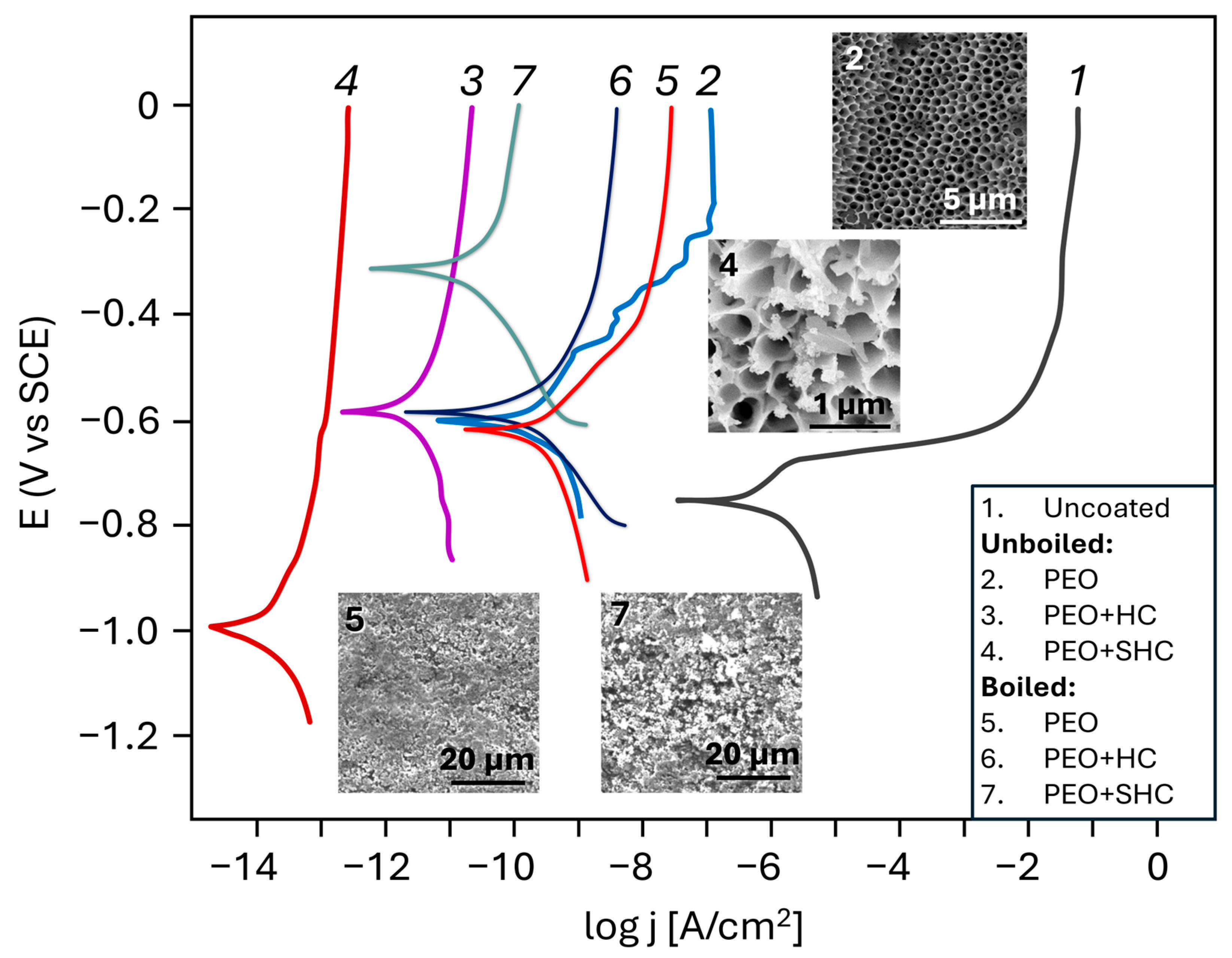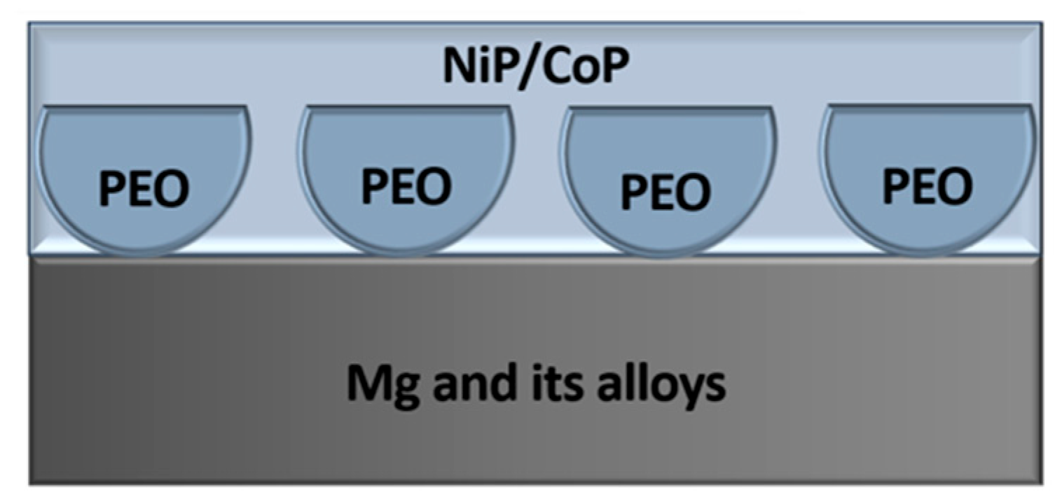 - Magnesium is the eighth most abundant element on Earth, providing ample resources for the use of Mg and its alloys across various engineering sectors. The advantages of magnesium alloys include high strength, low weight, and non-toxicity to both the environment and the human body [95,96,97,98,99,100]. However, magnesium possesses a highly electronegative electrode potential and exhibits a poor protective capability of its surface films due to their defective nature [99,100,101,102,103,104]. To ensure effective protection of magnesium and its alloys, chemical oxidation formulations have been developed, in which the main components are chromium salt compounds. As a result, oxychromate oxide-conversion coatings (OCCs) with a thickness of several micrometers are formed on the magnesium surface, with their color depending on the composition of the solution and the alloy used [105]. Due to the toxicity of such solutions, alternative methods have been developed to improve the corrosion resistance of oxide layers on magnesium parts and components. Currently, anodizing, the Dow-17 process, and PEO are the most widely employed techniques [98,100,106,107,108,109,110,111,112,113,114,115,116].