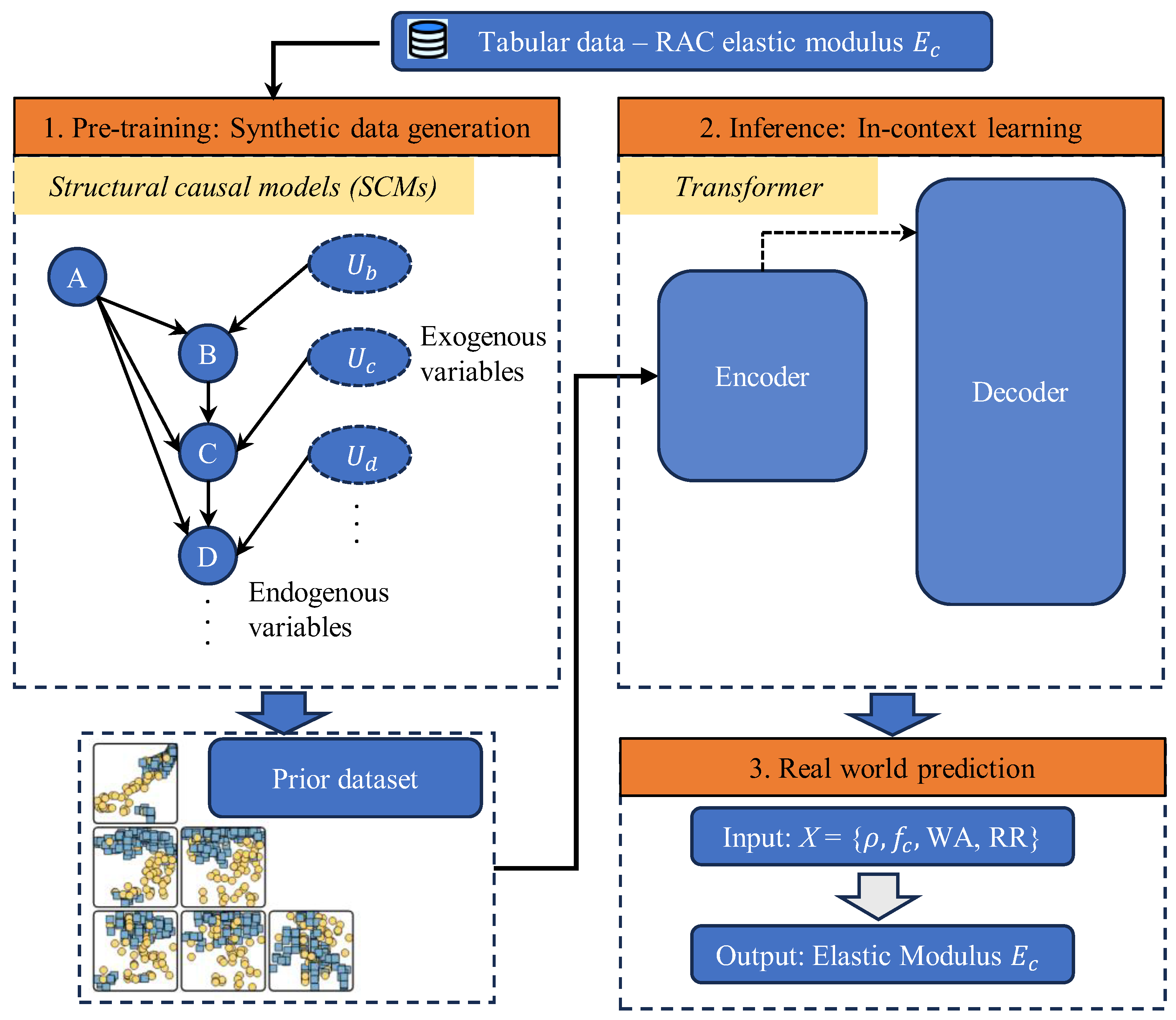In response to this need, the present study introduces the Tabular Prior-data Fitted Network (TabPFN)—a transformer-based foundation model originally developed for tabular inference—as a novel solution for predicting the elastic modulus (Ec) of RAC [56,57,58,59]. The principle and workflow of TabPFN are illustrated in Figure 1. Unlike conventional machine learning algorithms that must be retrained for each dataset, TabPFN functions as a pretrained Bayesian learner, having been exposed to millions of synthetic tasks generated from Bayesian Neural Networks (BNNs) and Structural Causal Models (SCMs). This prior knowledge enables one-shot Bayesian prediction on small and heterogeneous datasets—precisely the regime in which most RAC databases exist.