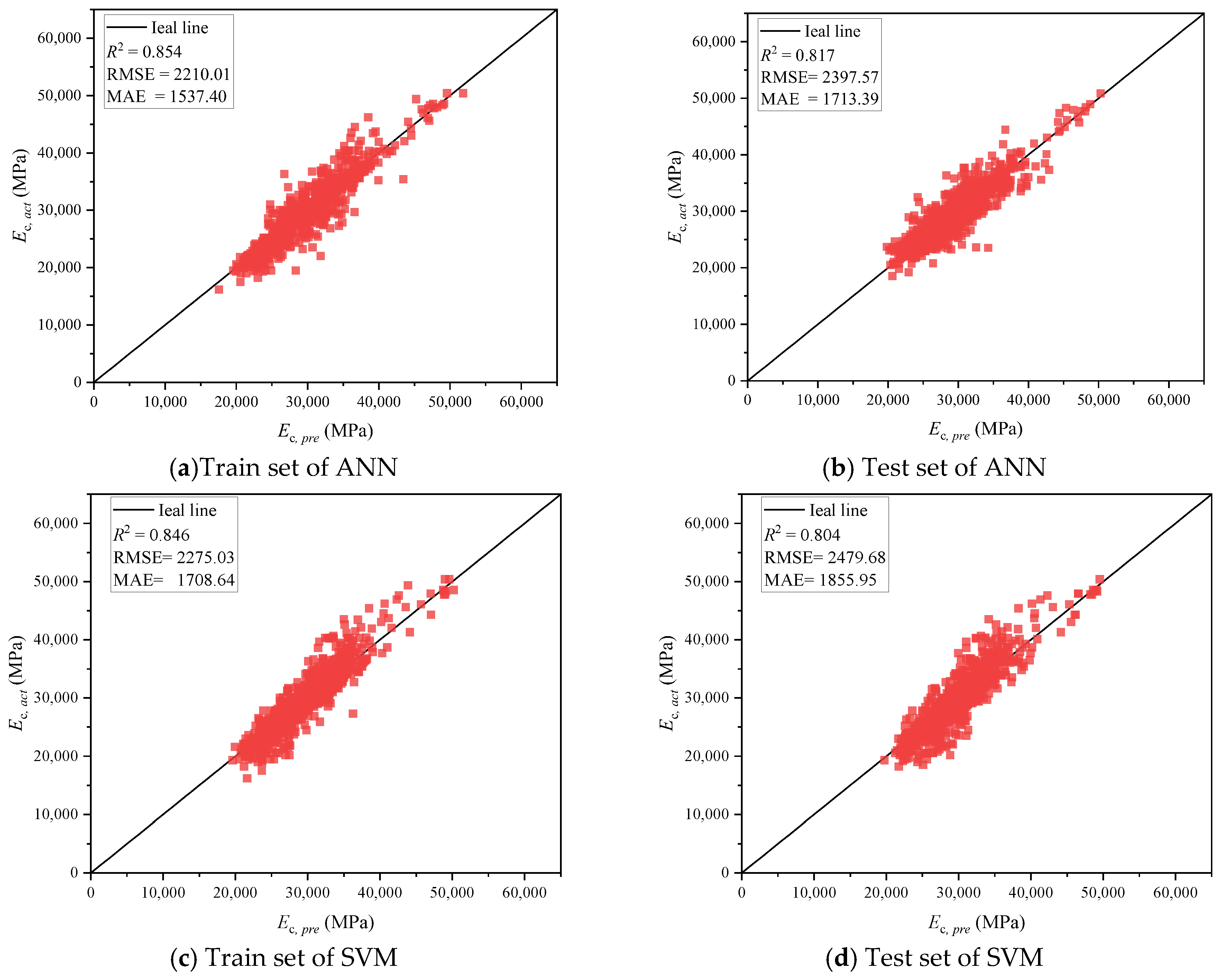 In view of these limitations, researchers have increasingly turned to data-driven modeling to capture the nonlinear and coupled influences of mixture design and aggregate characteristics. Machine learning (ML) techniques—such as Artificial Neural Networks (ANNs), Random Forests (RFs), and Support Vector Machines (SVMs)—have been widely employed to predict RAC properties, including compressive strength, tensile capacity, and elastic modulus [52,53,54,55]. These methods offer higher flexibility than empirical correlations and can uncover hidden patterns within multi-source data.