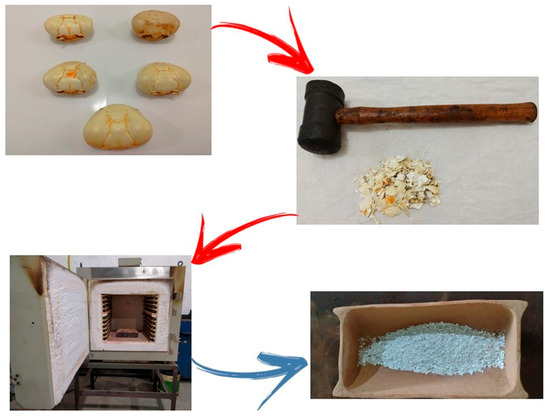 The process was performed in a muffle furnace, model 9612 by Jung, located at the Machining Laboratory of the Mechanical Engineering Technical Program, Federal Institute of Pará (IFPA)—Belém Campus. The calcination was conducted at 800 °C for 3 h, resulting in a grayish powder with an ash-like appearance, characteristic of calcium oxide formation. The phase composition of the calcined material was inferred from its color, texture, and reactivity rather than confirmed by direct X-ray diffraction (XRD) analysis. Although a diffraction pattern of the calcined Ucides cordatus crab shell was not obtained in this work, the formation of calcium oxide (CaO) as the predominant phase can be reasonably inferred based on the literature for similar marine biowaste precursors calcined at 800 °C. Previous studies have shown that crustacean shells subjected to thermal treatment above 750 °C exhibit complete decomposition of CaCO3 into CaO, with no residual calcite or aragonite peaks detected in XRD spectra [10,11,12,13]. The observed grayish coloration and the vigorous reactivity of the powder in water further support the conversion of CaCO3 to CaO, which served as the calcium source for HA synthesis. Figure 1 shows the process of preparing organic waste.