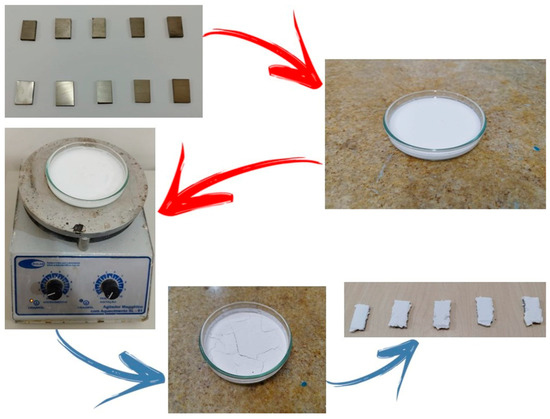 The quantities used were 0.72 g of calcium oxide, 11.62 g of tricalcium phosphate, and 30 g of distilled water. After preparing the reaction mixture, two sets of samples—CT (with surface treatment) and ST (without surface treatment), each containing five specimens—were placed in Petri dishes and covered with the prepared mixture. The magnetic stirring was maintained at 80 rpm, and the temperature was controlled at 37 °C, according to the parameters described by [26]. The heating process continued until the complete evaporation of the liquid, leaving only the solid residue adhered to the surface of the samples, which occurred after approximately 2 h for each group.