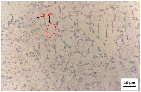 Figure 3 shows the micrograph of the titanium alloy studied, obtained by optical microscopy at 200× magnification after chemical etching by immersion in Kroll’s reagent for 80 s.