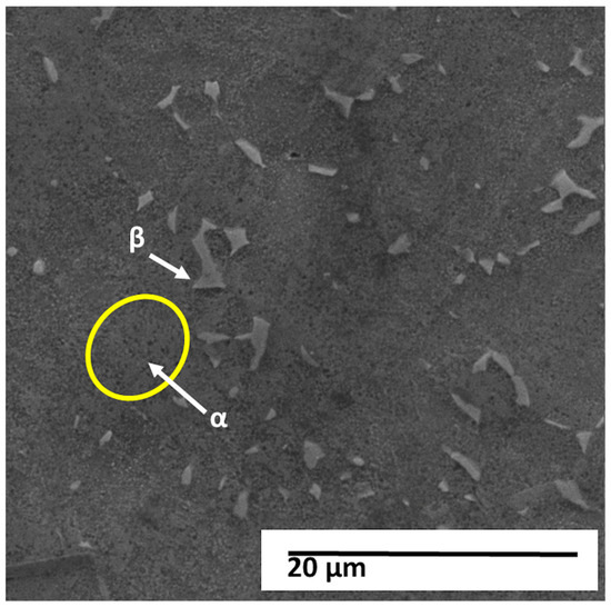 SEM micrograph of the Ti–Al–V alloy showing the α and β phases of the microstructure. The brighter regions correspond to the α phase, while the darker lamellae represent the β phase. Scale bar = 20 µm.