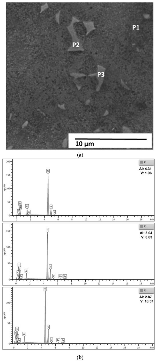 The spectra obtained reveal significant differences in the concentrations of aluminum (Al) and vanadium (V), reflecting the chemical heterogeneity typical of two-phase titanium alloys. At point P1, an Al content of 4.31% and V of 1.96% were observed, while at points P2 and P3 the measured values were, respectively, Al = 3.04%; V = 8.03% and Al = 2.87%; V = 10.57%.