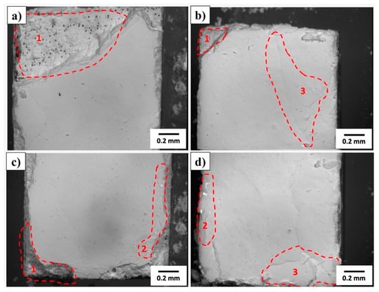 In specific regions of the micrographs, labeled 1, 2, and 3, material accumulates at the edges and corners of the samples, forming a thicker layer, characteristic of drying by meniscus recession, a phenomenon known as coffee-ring. This effect occurs due to the capillary migration of solid particles from the center to the edges during solvent evaporation, resulting in a thickness gradient between the center and the edges of the sample. Consequently, thicker edges tend to concentrate residual drying stresses, increasing the propensity for microcrack formation and localized spalling.