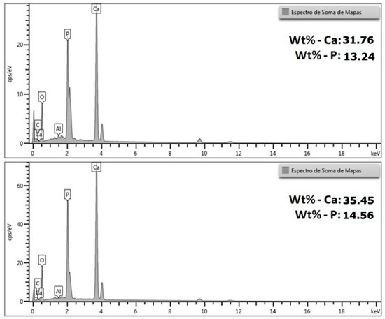 In both analyses, the characteristic peaks of calcium (Ca), phosphorus (P) and oxygen (O) are observed—main elements of the crystalline structure of HA—in addition to smaller signals of carbon (C) and aluminum (Al), which may be related to the presence of traces of the carbon conductive tape, the analysis environment or the underlying metallic substrate.