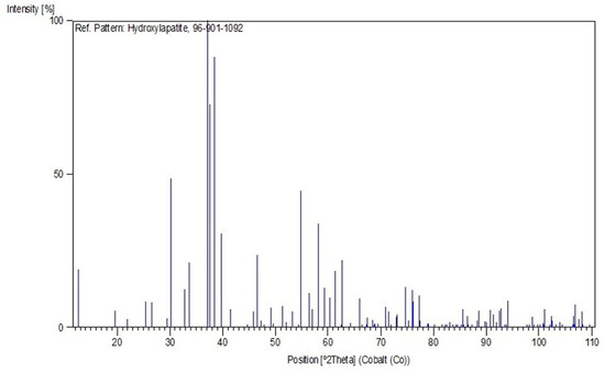 Figure 12 shows the X-ray diffractogram (XRD) of the ceramic layer deposited on the metallic substrate, identifying the characteristic peaks of HA according to the ICDD 96-901-1092 reference standard [31].