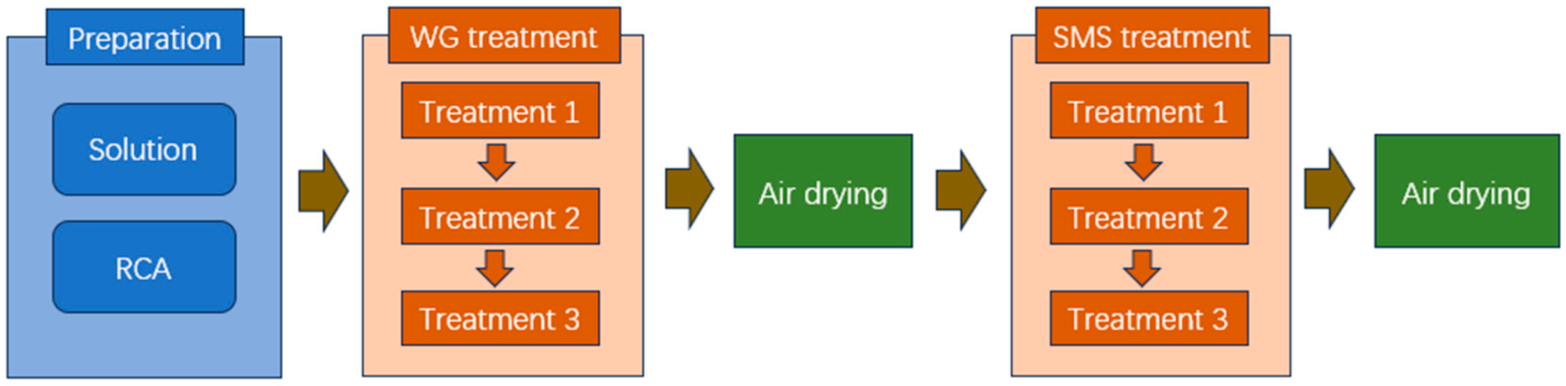 To save materials, the spraying method was adopted to treat RCA, and the schematic of the spraying system is shown in [35]. A single spraying cycle consists of spraying solution for 10 s, followed by a 10 s interval. To ensure thorough absorption of the RCA, three spraying cycles were performed. During the spraying treatment, the RCA was kept in a vibrating state. The treatment process, using either WG solution or SMS solution alone, is shown in Figure 3. The treatment process using both WG and SMS solutions for RCA is shown in Figure 4. The test scheme is listed in Table 3. The preparation of all solutions was controlled according to the mass percentage.