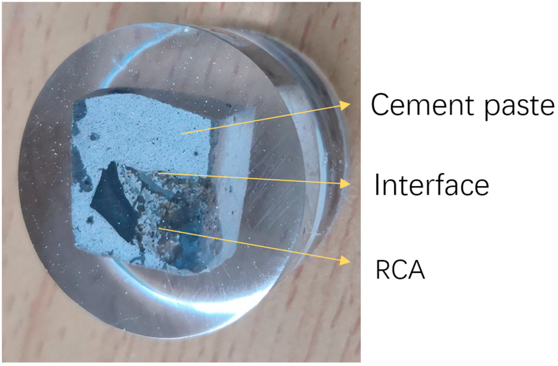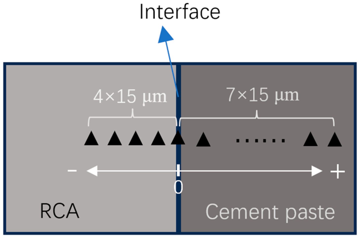 Nanoindentation (NI) was employed to evaluate the effect of different RCAs on the interfacial transition zone between RCA and new mortar. First, the treated RCAs were selected before the preparation of RACs. Next, the selected RCAs were placed in 3 cm cube molds, and a 0.5 water-to-cement ratio (w/c) paste was poured into the molds. After 1 day, the samples were demolded and cured for 28 days. Then, the samples were cut and embedded in resin. Finally, the samples were ground and polished. A typical sample is shown in Figure 5. The arrangement of NI points is depicted in Figure 6. The scheme of the NI test is listed in Table 6.