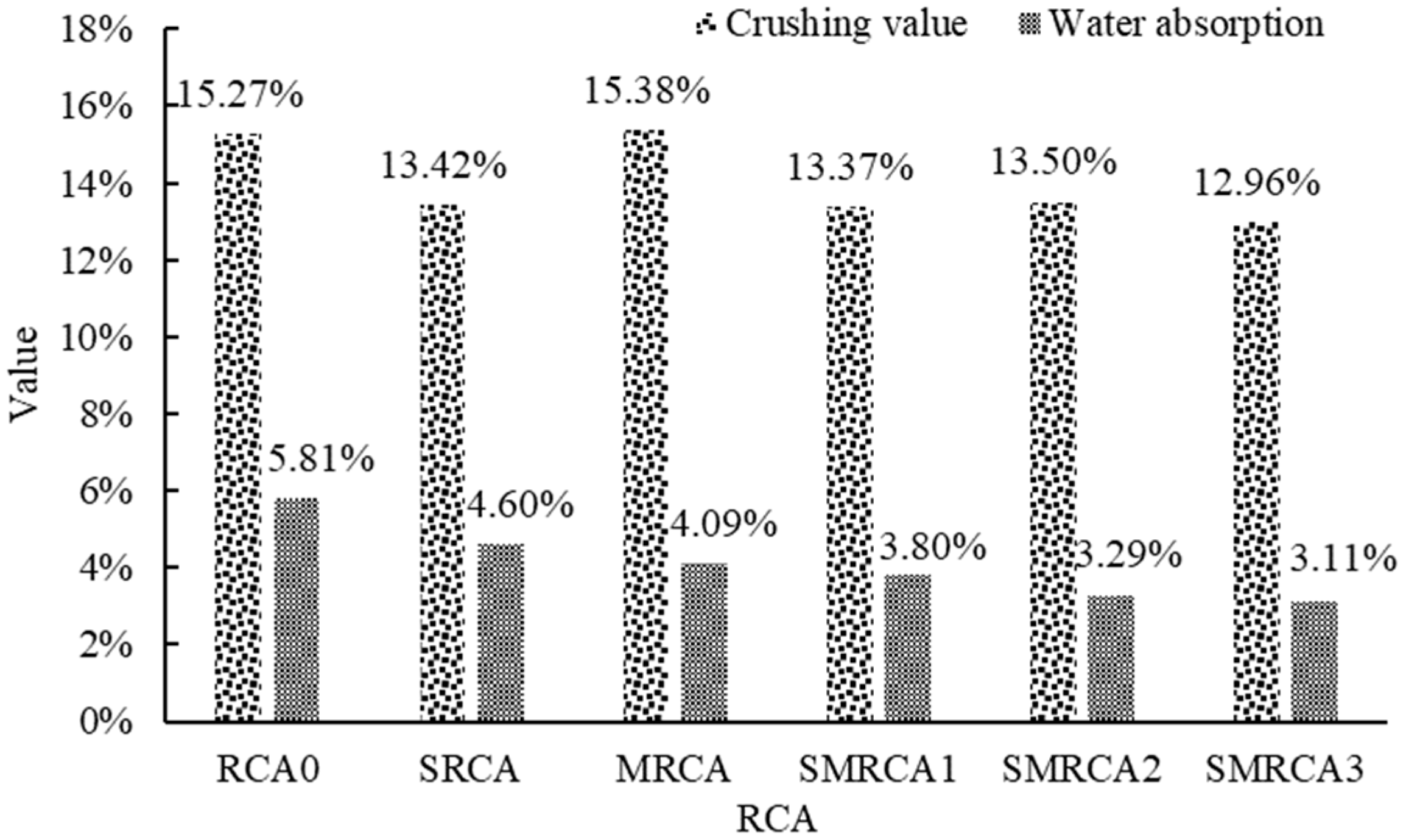 Based on the Chinese code of Recycled coarse aggregate for concrete (GB/T 25177-2010) [34], the crushing value test and water absorption test were conducted to evaluate the influences of the treatment method on the RCA.
