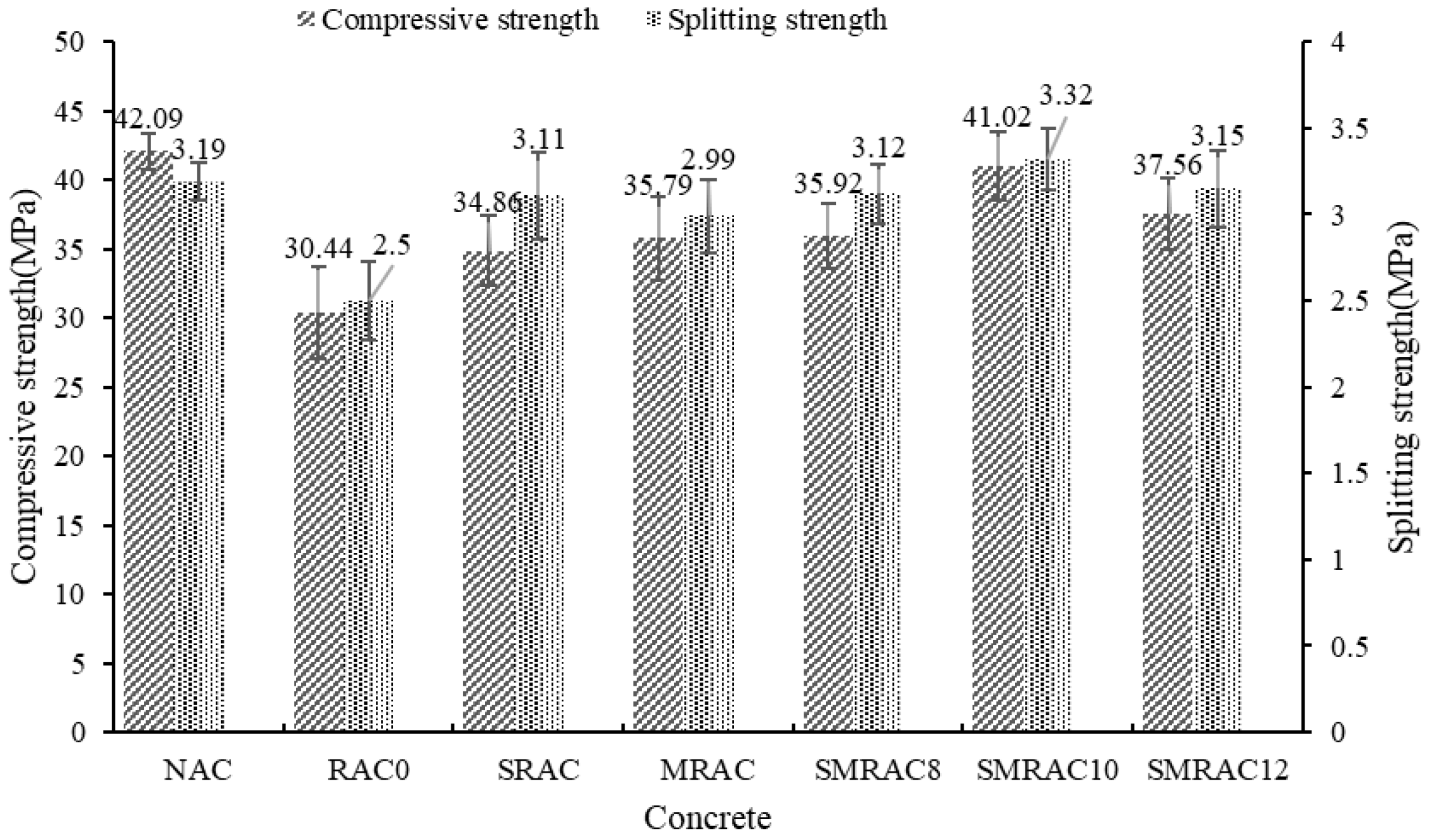 For MRAC, the SMS-solution-treated RCA was used to replace the NCA, and the compressive strength and splitting tensile strength increased by 17.6% and 19.6%, respectively. According to the RCA test results, the SMS solution could not enhance the strength of the RCA; hence, the strength enhancement of MRAC was due to the improvement of the interface between the MRCA and the new mortar.