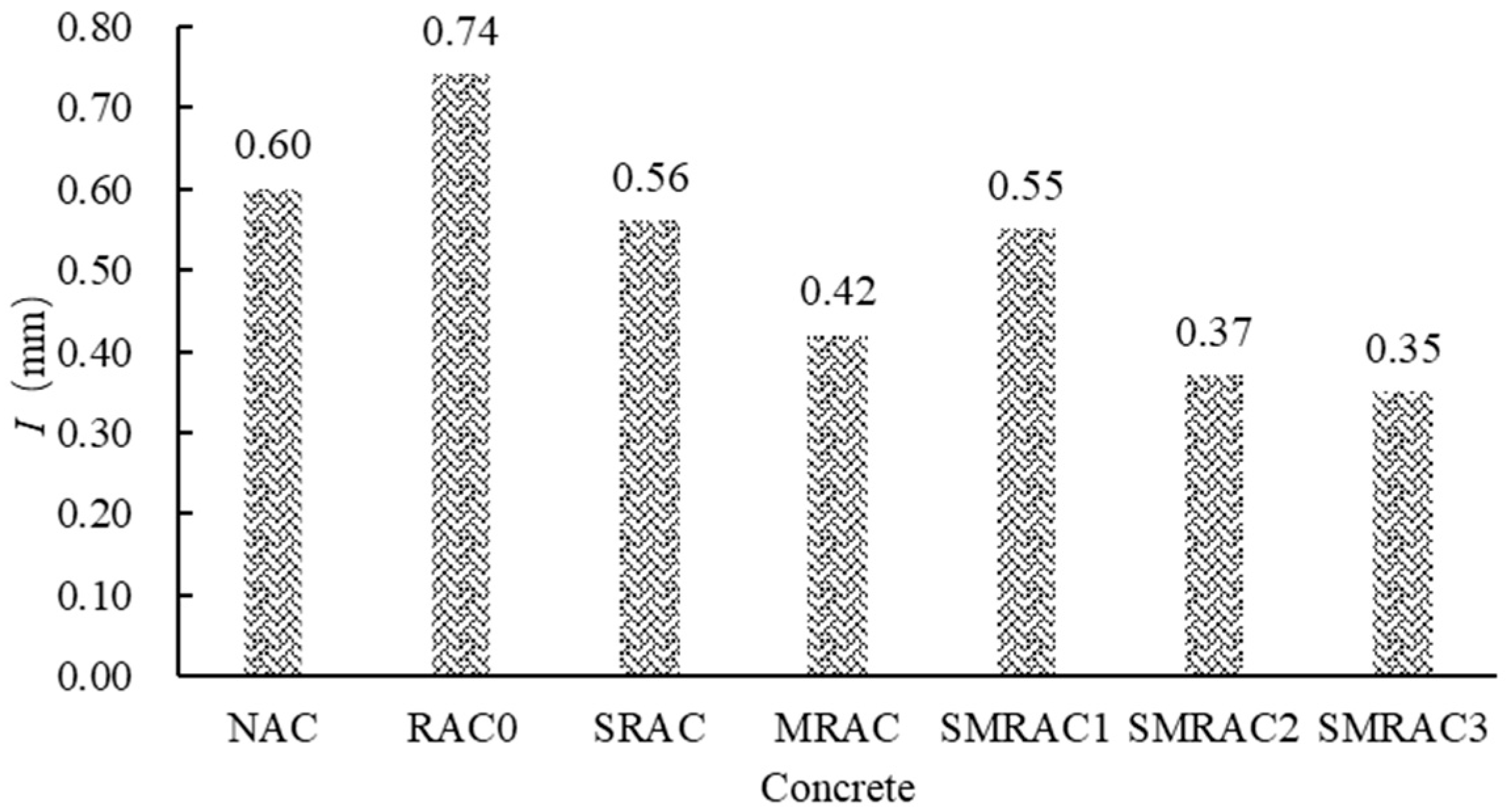 When the SRCA was used to replace the NCA, the I of the SRAC (ISRAC) showed a significant decrease. Compared to the RAC0, the ISRAC decreased by 24.32%. This result is attributed to the reduction in water absorption of RCA caused by the WG solution treatment. When MRCA was used in concrete, the I of the MRAC (IMRAC) showed a further decrease, which was lower than that of the NAC. Compared to RAC0, the IMRAC decreased by 43.24%. This is because the SMS solution can form a hydrophobic layer near the interface between the MRCA and the new mortar, effectively preventing the water transmission.