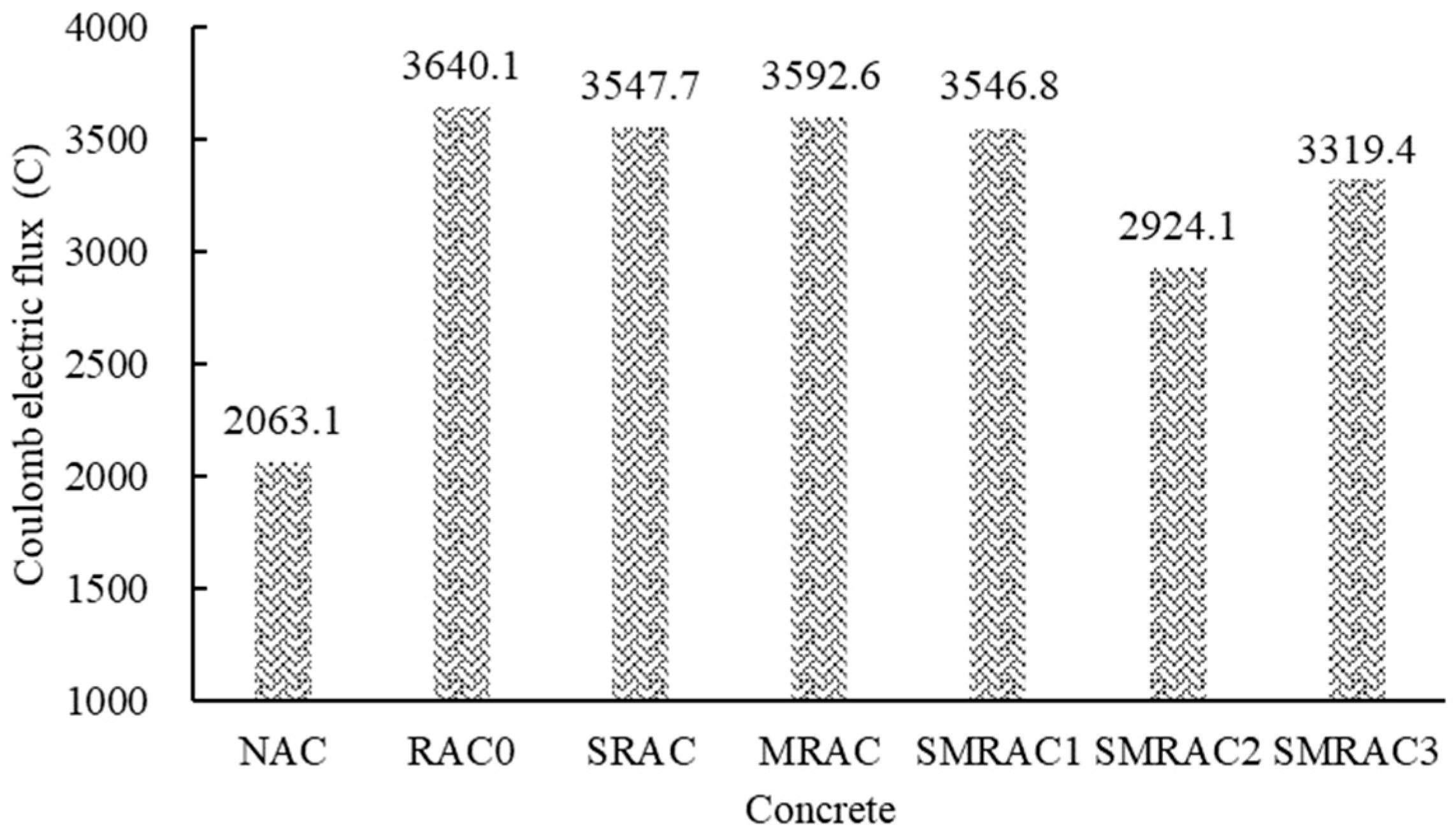 The results of the coulomb electrical flux (CEF) are shown in Figure 13. The CEF of the NAC was minimal, indicating that its ability to resist chloride ion penetration was the strongest. When the NA was replaced by the untreated RCA, the CEF of the RAC0 showed the highest value. This is because the adhered mortar of the RCA is porous, making it easier for water and chloride ions to penetrate the RAC0. When SRCA was used, the CEF of the SRAC was slightly affected. This is due to the modification effect of the WG solution, which could enhance the surface layer of the old mortar. However, it has little impact on the overall permeability of the concrete. According to the result for the MRAC, the influence of the SMS-solution-treated RCA on CEF was also insignificant. This is because the structure of the treated RCA was not changed and only a molecular film was formed. Under the saturation conditions, the hydrophobic molecular film could not effectively prevent the transmission of water. When the RCAs were treated with the WG solution combined with the SMS solution, the CEF of the SMRAC2 exhibited the most significant decrease, dropping by 19.67%. Nevertheless, it remained 41.73% higher than that of the NAC. This is due to the improvement of the pore structure within the SMRAC2, leading to the decrease in CEF. However, the porous old mortar of the treated RCA still cannot effectively prevent the penetration of chloride ions in a saturated state.