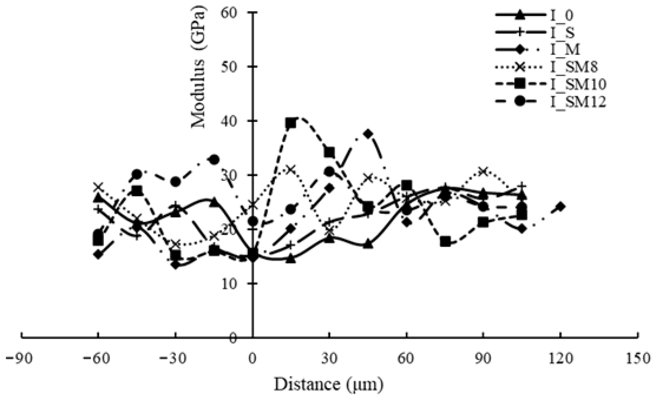 Figure 14 presents the nanoindentation results, revealing two distinct types of interface transition zones (ITZs). The first type exhibited a traditional weakening pattern, such as I_0, I_S. The modulus within the weakening ITZ was lower than that of the matrix mortar; similar results were also reported in [32]. The second type showed a strengthening pattern, such as I_M, I_SM8, I_SM10 and I_SM12. The modulus within the strengthened ITZ was higher than that of the matrix mortar. Mechanistically, when the SMS-modified RCA was incorporated into the new concrete system, the SMS coating not only formed a durable bond with the RCA substrate but also underwent chemical interactions with the fresh mortar. These reactions generated expansive products that effectively filled interfacial voids, resulting in the microstructural densification of the ITZ and consequent mechanical improvement. The I_SM10 specimen exhibited the maximum ITZ modulus, demonstrating that the optimal SMS solution concentration for performance enhancement is 10%. This phenomenon can be attributed to the concentration-dependent formation mechanism of hydration products. Increased SMS concentration (up to 10%) promotes the formation of expansive products within the ITZ, effectively reducing porosity through controlled volumetric expansion. Nevertheless, exceeding the critical concentration threshold (>10%) induces excessive products that generate internal stress concentrations, ultimately initiating microcracks that compromise the interfacial integrity and mechanical properties.