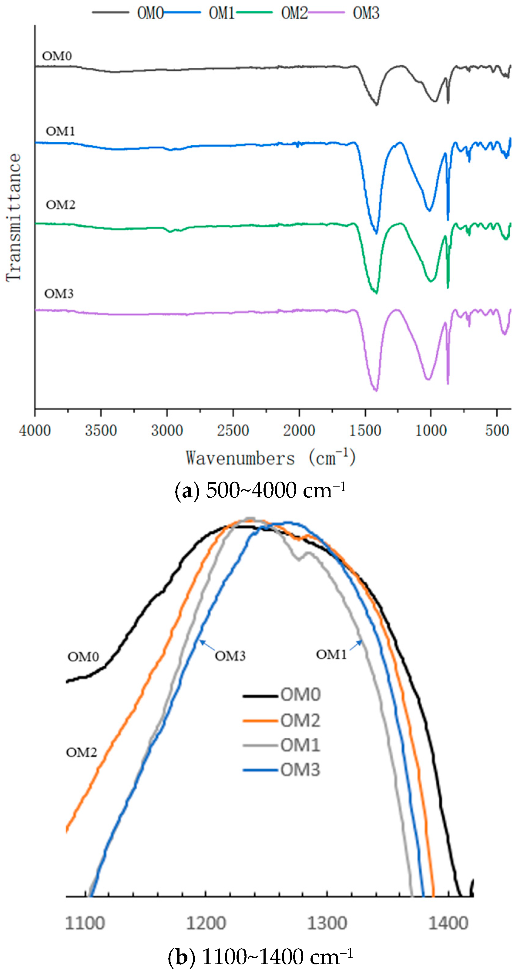 The FTIR results are shown in Figure 15 and Figure 16. As shown in Figure 15a, the Si-O absorption peak appears around 1016 cm−1, while the C-O absorption peaks are detected at approximately 1410 cm−1 and 870 cm−1, with no significant H-O absorption peak [50,51]. This suggests that Ca(OH)2 in the old mortar has reacted adequately with CO2 from the air [52,53]. The infrared spectra of different old mortars are essentially identical and similar to that of common cement concrete. This indicates that neither the WG solution nor the SMS solution significantly influenced the functional groups of the old mortar. Unlike other samples, the old mortar treated with the SMS solution showed an absorption peak around 2960 cm−1 and 1270 cm−1, as shown in Figure 15. This was the absorption peak of the methyl group [54], which was formed through the interaction between SMS and the old mortar. This chemical modification is responsible for imparting hydrophobicity to the treated old mortar.