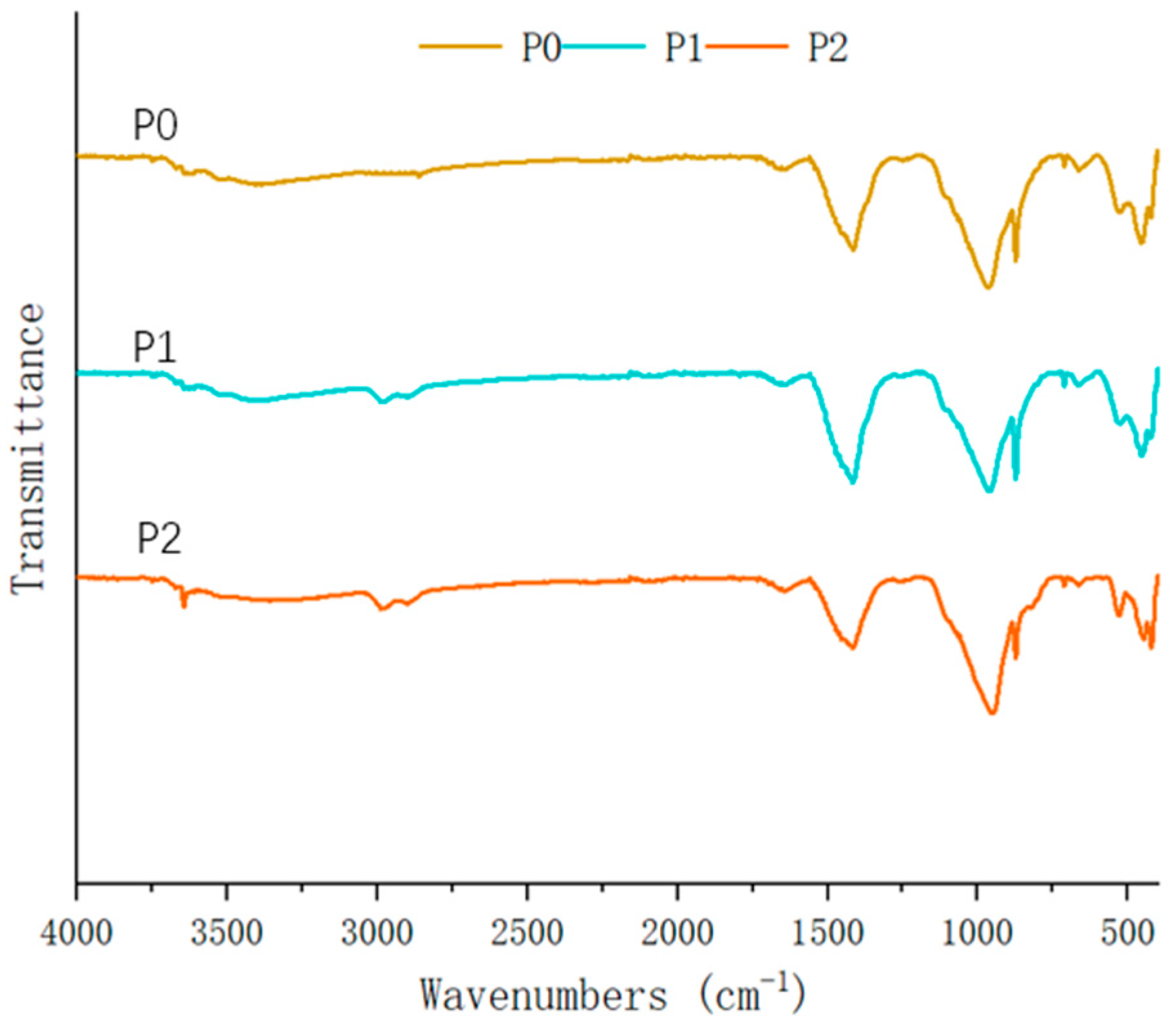 The FTIR analysis of new cement pastes (Figure 16) revealed spectral characteristics that are fundamentally consistent with the reference sample (P0), indicating that the SMS solution’s interaction with the cement hydration products preserved the essential functional group chemistry of the hardened matrix. Notably, the characteristic absorption band near 2960 cm−1 appeared, which meant that the methyl group also existed in P1 and P2. In new cement paste systems, the predominant reaction involves the SMS solution interacting with CaO to form calcium methyl silicate, a chemical transformation that fails to impart hydrophobic properties to the cementitious matrix [45,55].