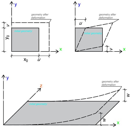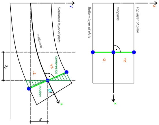 Total plate displacements schematic. The z-direction displacement due to bending is times z. Under the condition , is a small angle and the displacement is for negative (compression) and for positive (tension) [13].